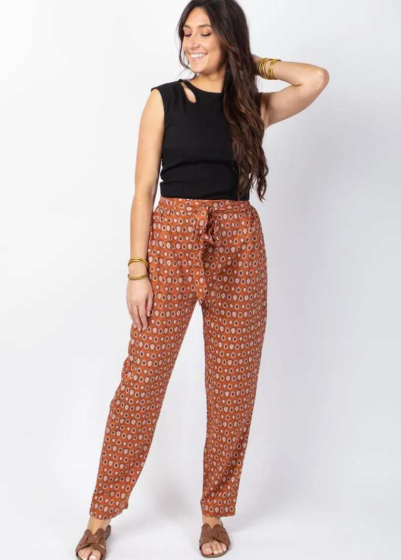 Pantalon facile à porter et tellement tendance avec son joli motif ethnique camel très tendance.
