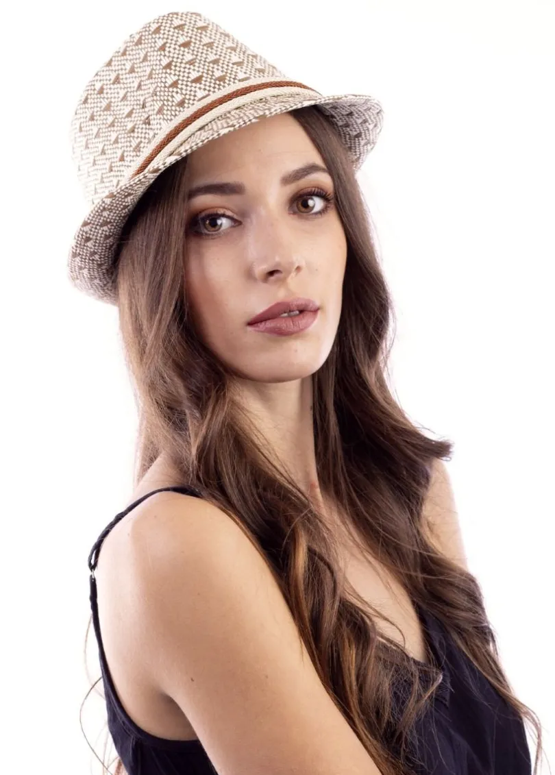 Découvrez nos borsalinos pour un look tendance et estival. Ce modèle marron avec motifs et son liseré bicolore tres…