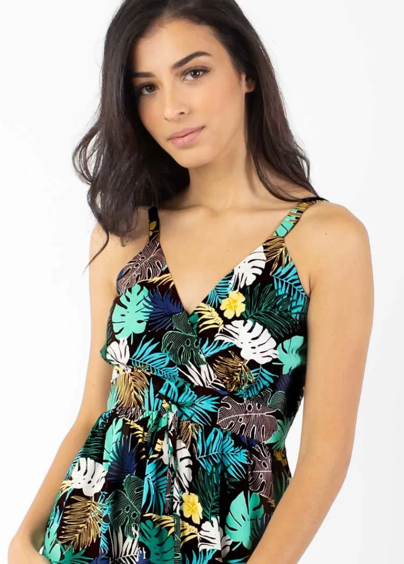 Journée festive et joyeuse avec la robe Morea et son imprimé tropical végétal! Les couleurs vivantes et éclatantes des motifs tropicaux éclairent chaleureusement notre tenue.