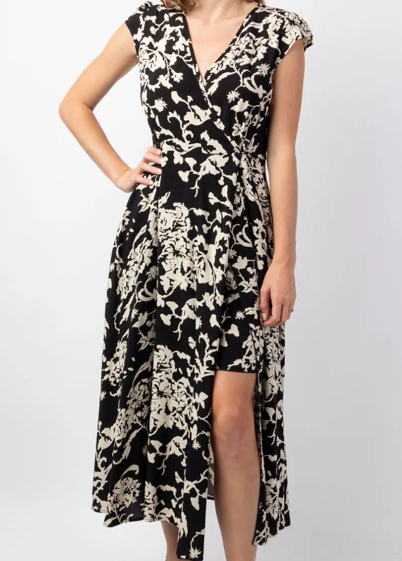 Cette robe mi-longue habillée sera parfaite lors de cérémonies. Ultra glamour, cette robe manches courtes, encolure en v croisé et taille cintrée se prolonge sur une doublure jusqu’à mi-cuisse du même motif que la robe pour un confort optimal.