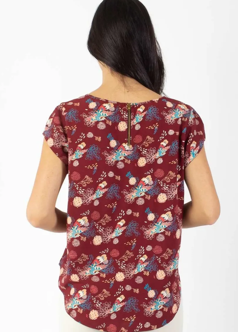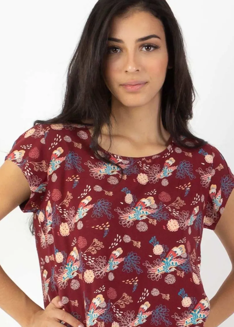Très beau top manches courtes en viscose. Sa coupe droite légèrement ample et son encolure arrondie font de ce top une valeur sûre. On aime son motif ethnique bordeaux ainsi que la longueur du top.