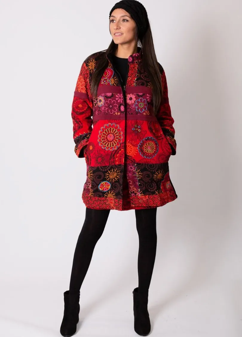 Envie de couleurs et d’imprimés ethniques cet hiver? Ne cherchez plus, le manteau Kwango rouge est fait pour vous. Lum…
