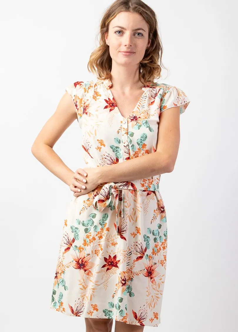 Superbe imprimé fleuri chaleureux et doux pour cette robe courte à l’esprit casual chic. On aime l’encolure en V et les petits volants qui retombent joliment sur l’épaule. Ceinture amovible pouvant cintrer la robe à la coupe droite légèrement ample. Cette robe courte est très facile à porter pendant la saison estivale.
