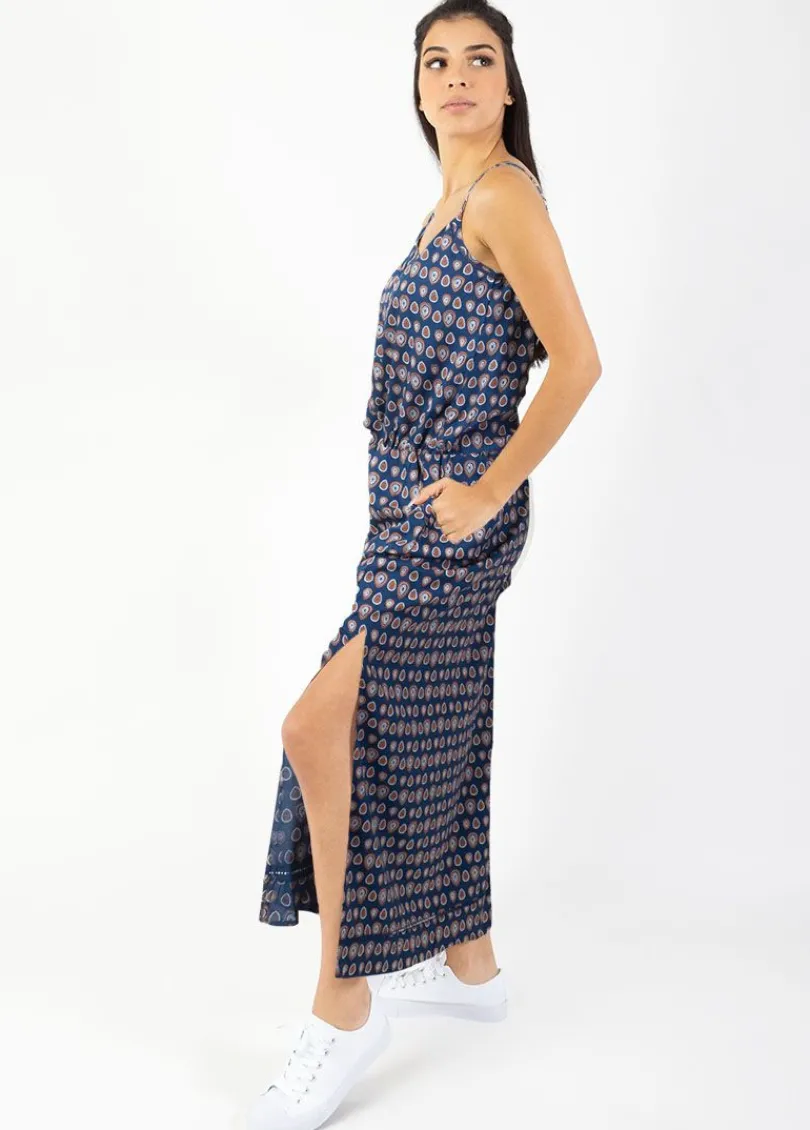 Cheap Coton Du Monde Robe longue fendue fines bretelles ALBA imprimé ethnique bleu 29 Marine