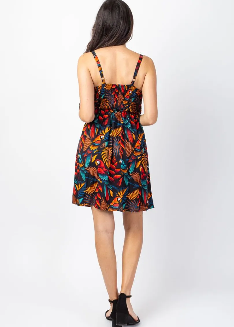 Osez la tendance exotique avec la robe Morea et son imprimé tropical original! Son superbe motif feuillage et perroquet aux belles couleurs vivantes donne de l’allure à cette robe courte.