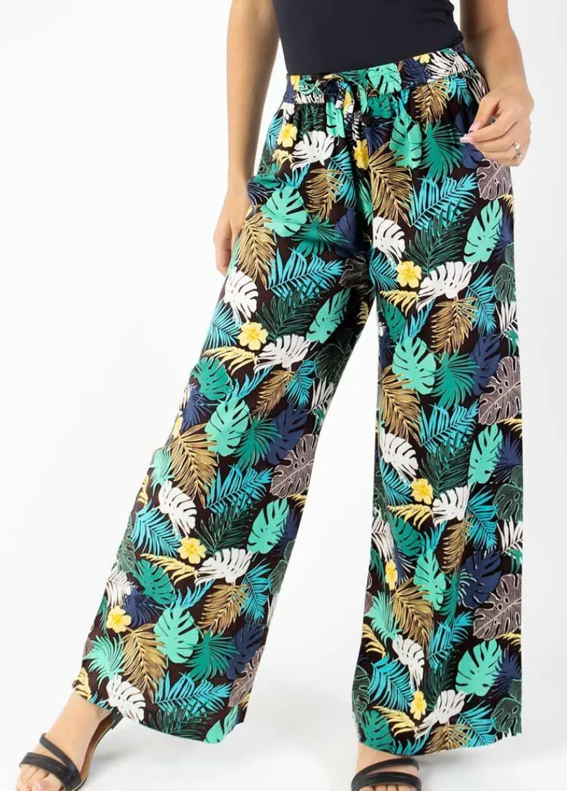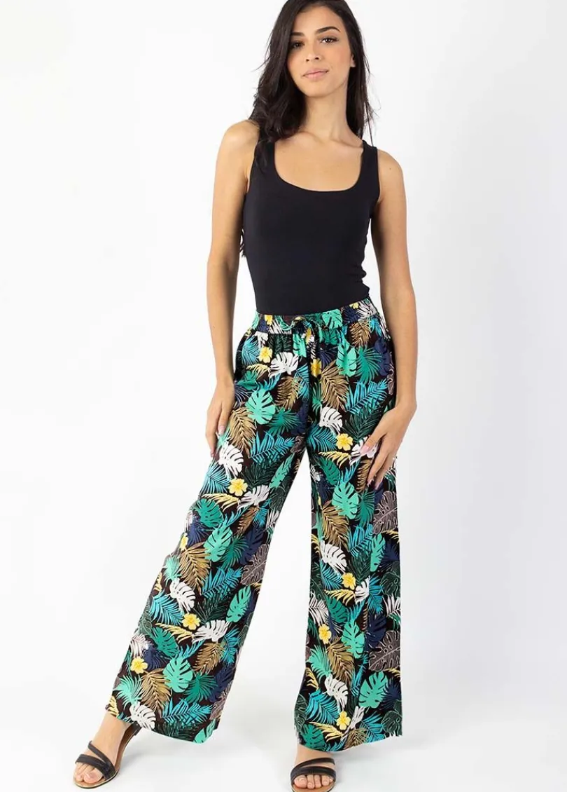 Superbe pantalon tendance au motif exotique tropical dans les tons verts. On aime sa coupe droite avec ses jambes larges…