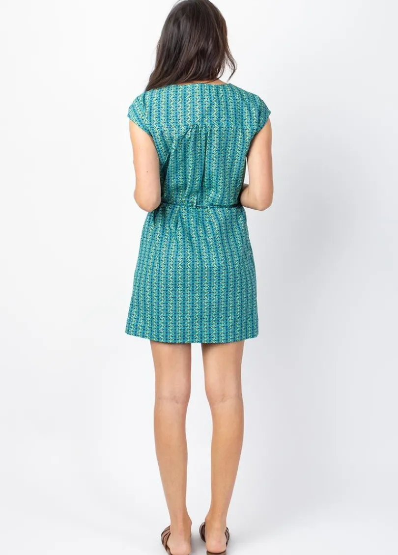 Robe courte en viscose coton mélangés pour un confort et une légèreté facile à porter pendant les vacances. Très féminine avec sa coupe droite légèrement cintrée, le motif ethnique d’une jolie couleur vert bleue et la ceinture amovible finition pompon, la robe courte Edona est la parfaite tenue de vos journées estivales ou pour vous rendre au bureau.