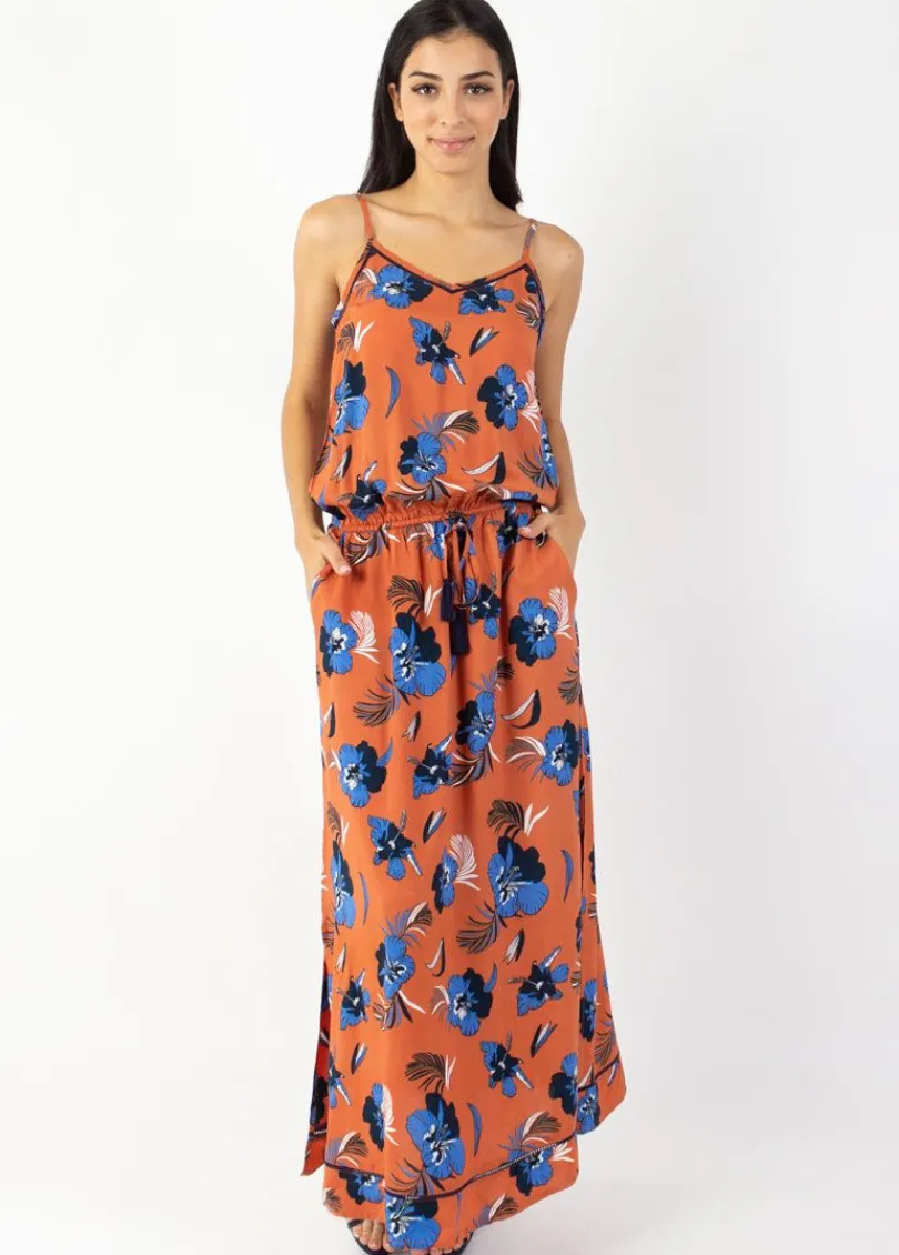 Cette robe longue aux douces couleurs terra cotta et marine sera une pièce tendance de votre dressing. Les fleurs tropicales reviennent en force cet été, à porter en robe de plage ou avec une paire de baskets, n’hésitez plus cette robe longue fluide et légère est faite pour vous!