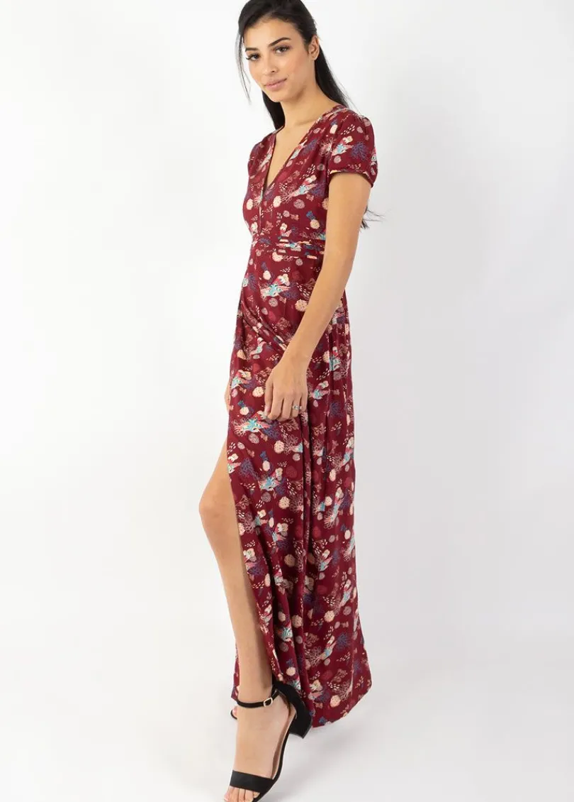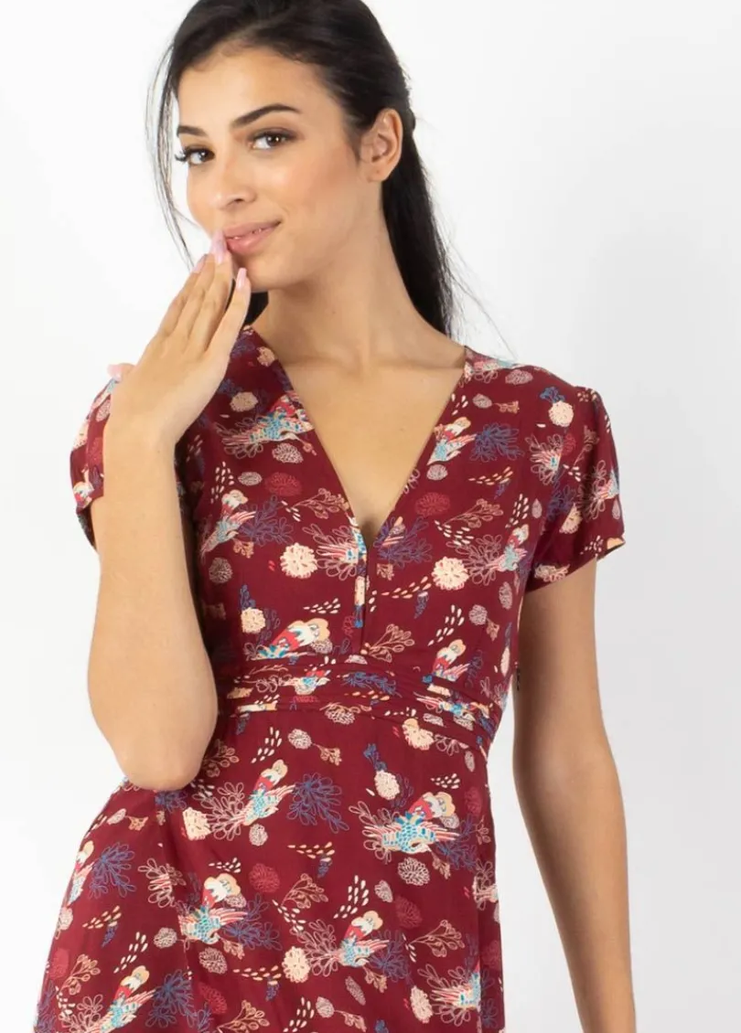 On aime l’imprimé paon aux couleurs vivifiantes sur le fond bordeaux de cette robe longue en viscose, très agréable à porter.
