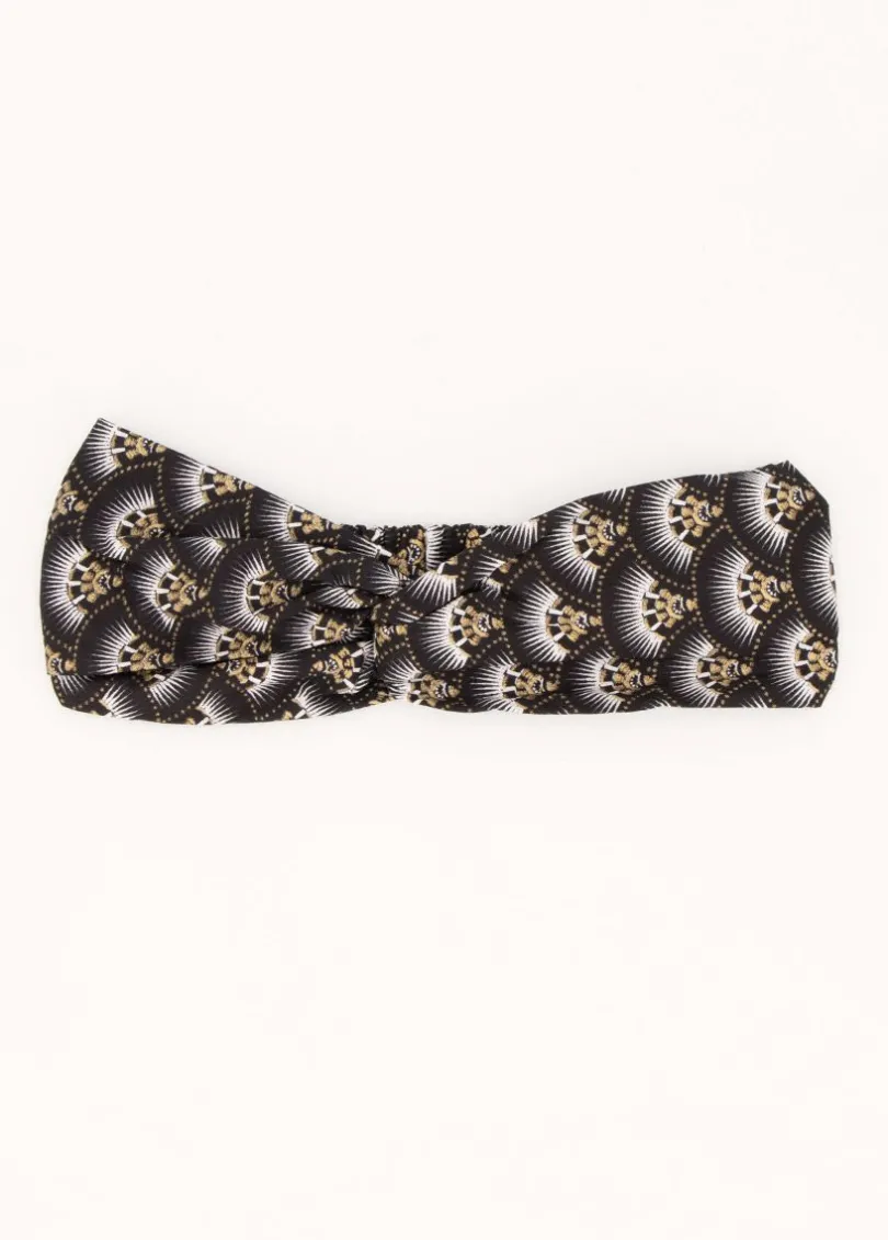 Facile à assortir avec de l’uni, du jean ou une de nos robes imprimées, optez pour cet accessoire à l’imprimé noir et doré qui viendra twister votre tenue.