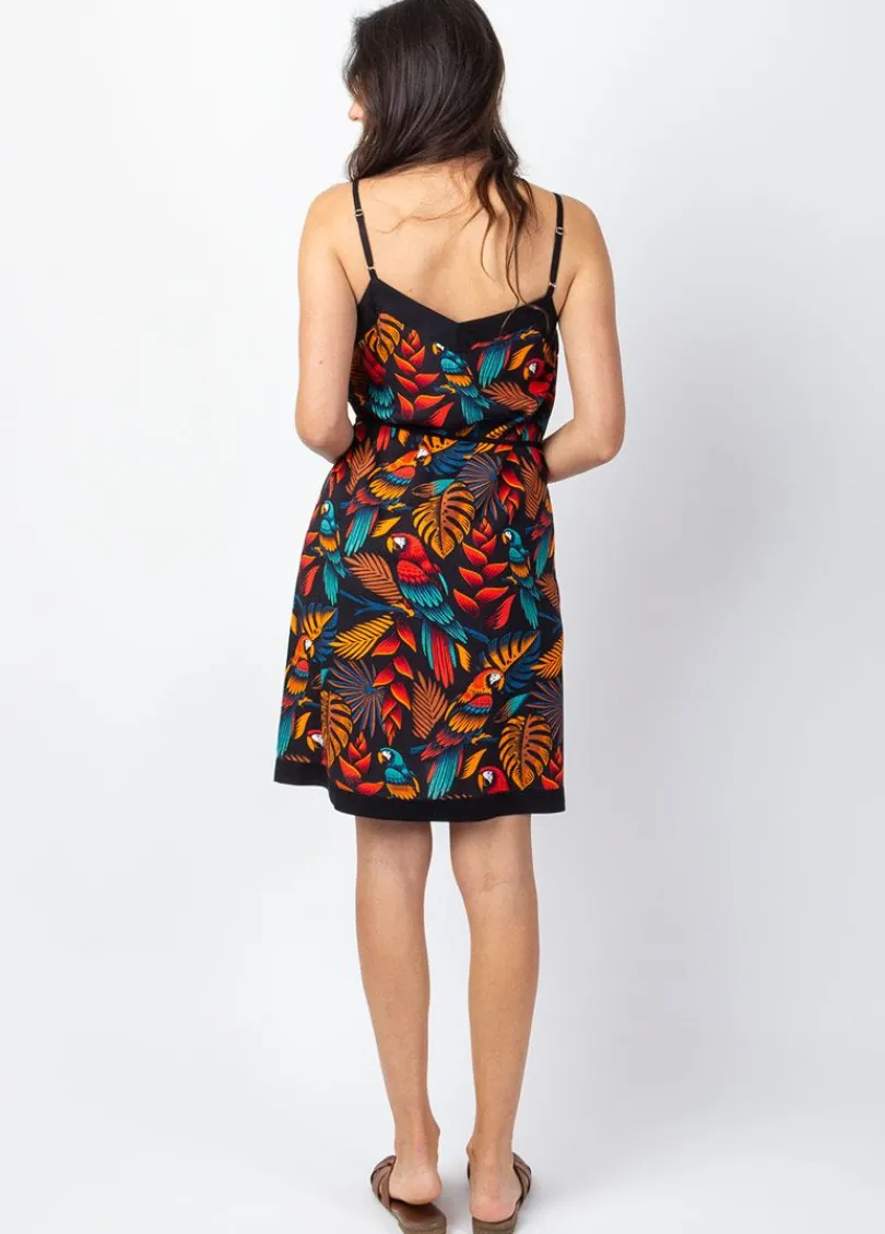Hot Coton Du Monde Robe courte fluide fines bretelles PALMA imprimé tropical noir Ara
