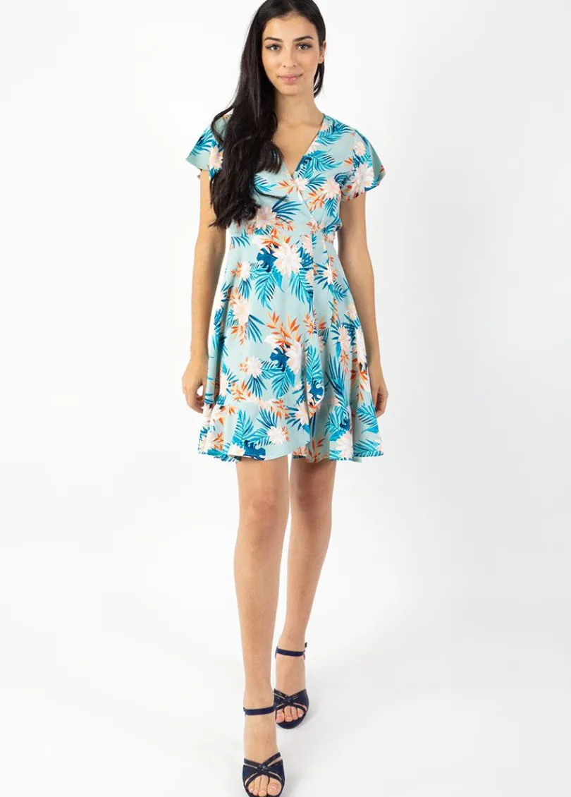 Hot Coton Du Monde Robe courte MARIKA fluide cache-cœur imprimé fleurs exotiques Exotique Menthe