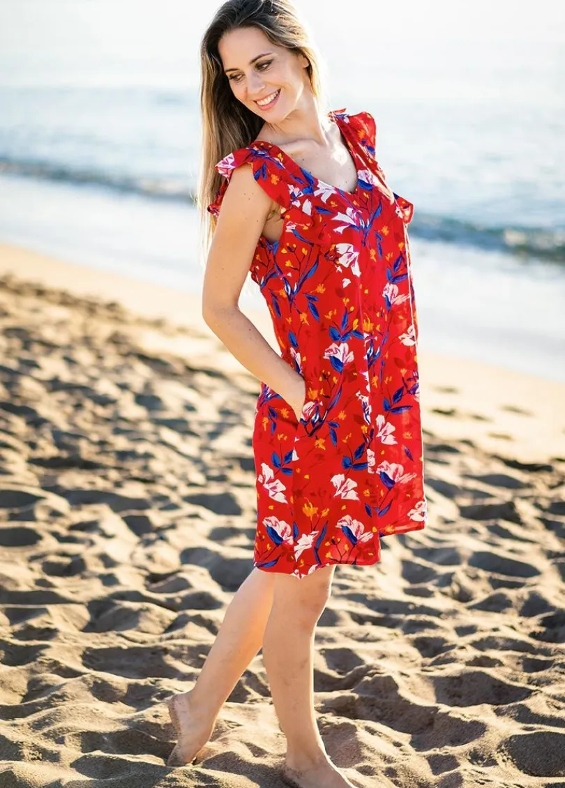 Cette jolie robe courte rouge à la coupe ample et au motif fleuri bleu et blanc conviendra à tout type de morphologie.