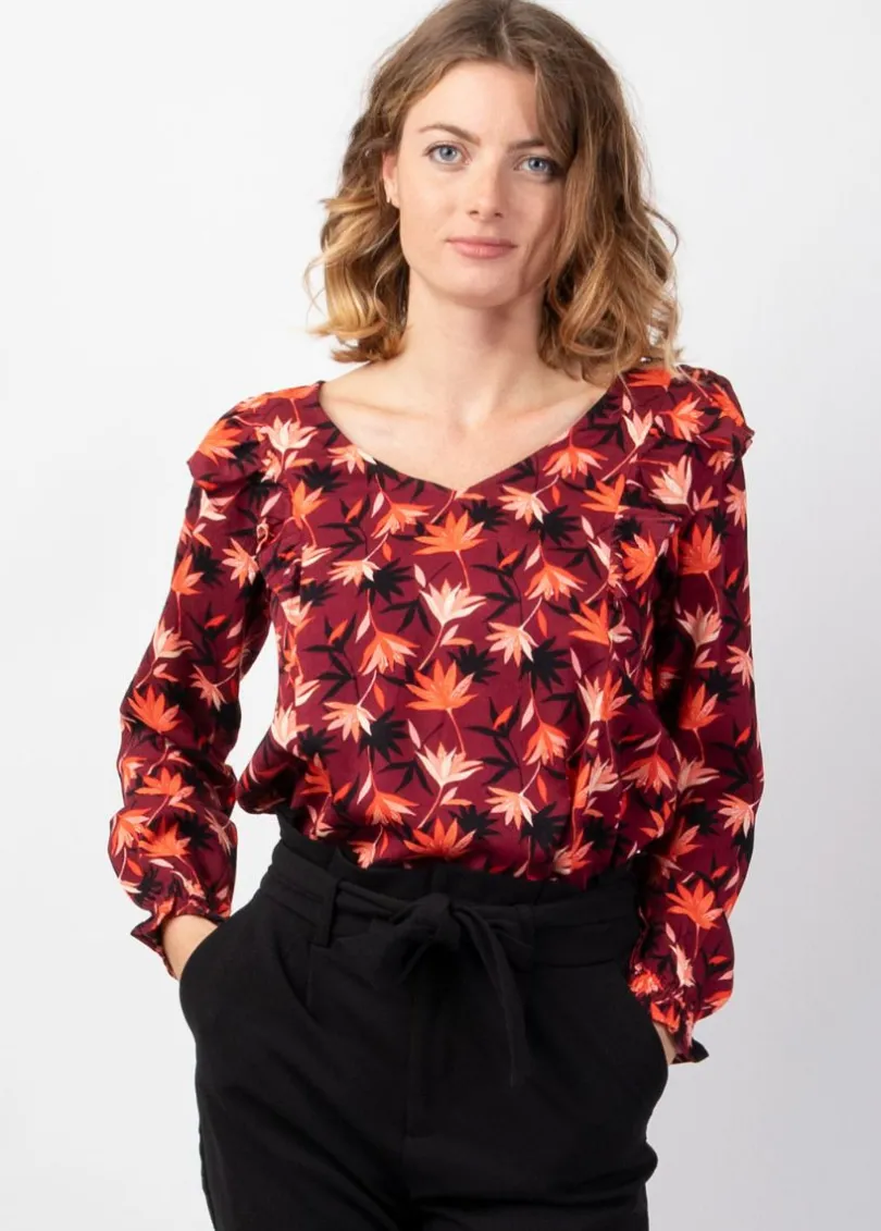 Blouse manches longues hiver à la coupe ample et au superbe imprimé fleuri grenat lumineux et agréable à porter. Dotée de volants pour une touche romantique chic, cette pièce conviendra au quotidien avec un pantalon basique noir ou un jean.