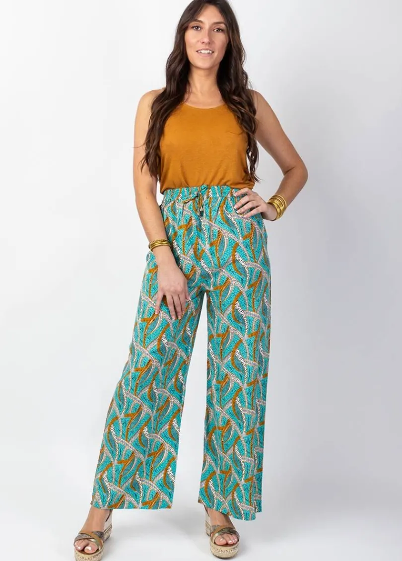Superbe pantalon au motif ethnique aux tons bleu turquoise très tendance. On aime sa coupe droite avec ses jambes large…