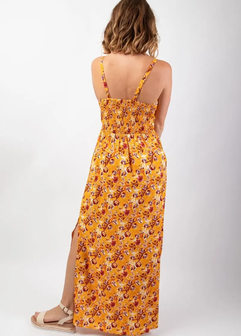 Robe longue à fines bretelles réglables facile à porter au quotidien. Cette robe longue en viscose a une coupe très élégante et féminine qui élance la silhouette. Cette robe longue à la belle couleur jaune et au motif fleuri estival, ensoleillera votre quotidien.