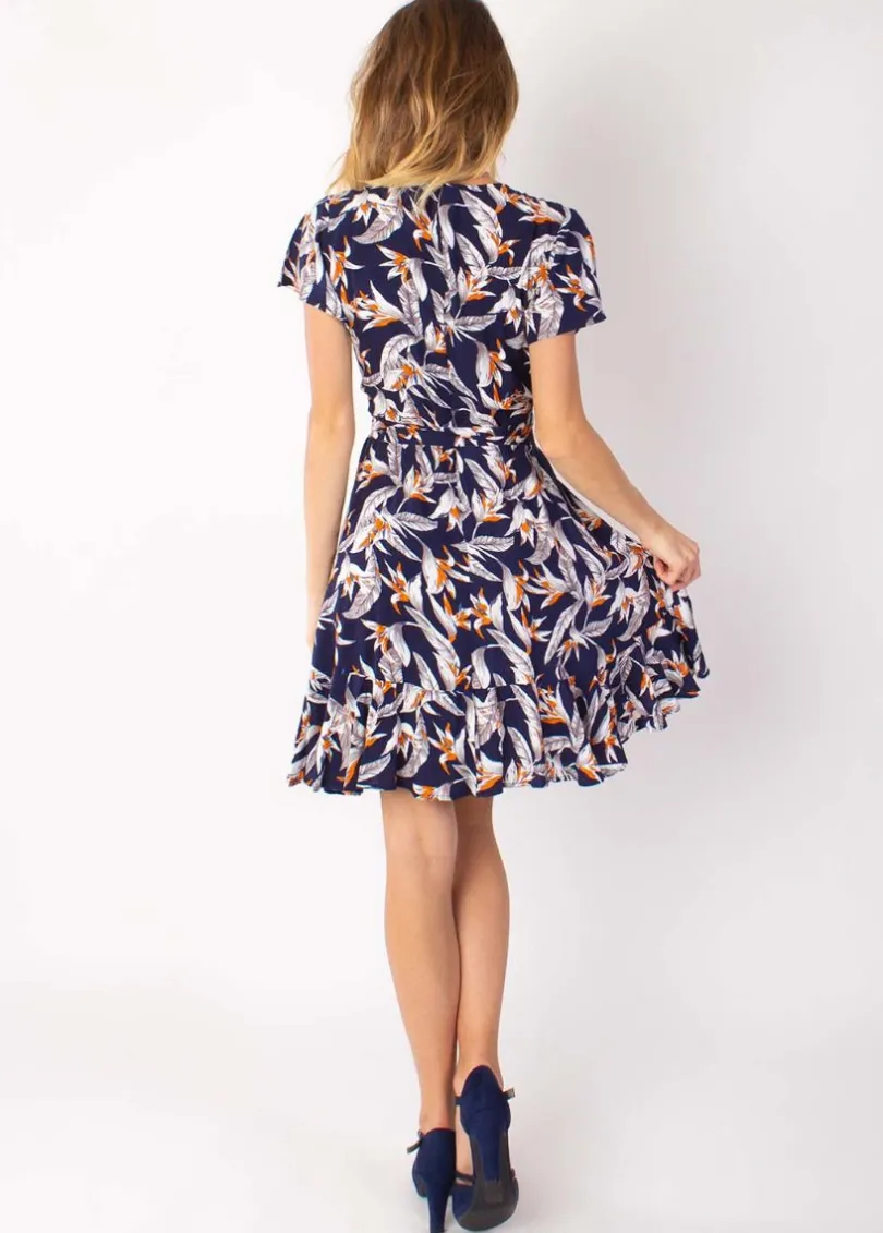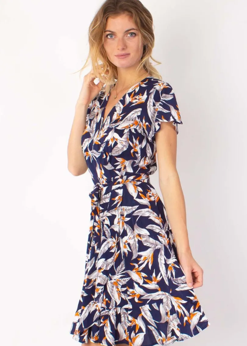 Outlet Coton Du Monde Robe courte MARIKA fluide cache-cœur imprimé fleur de paradis 14 Marine