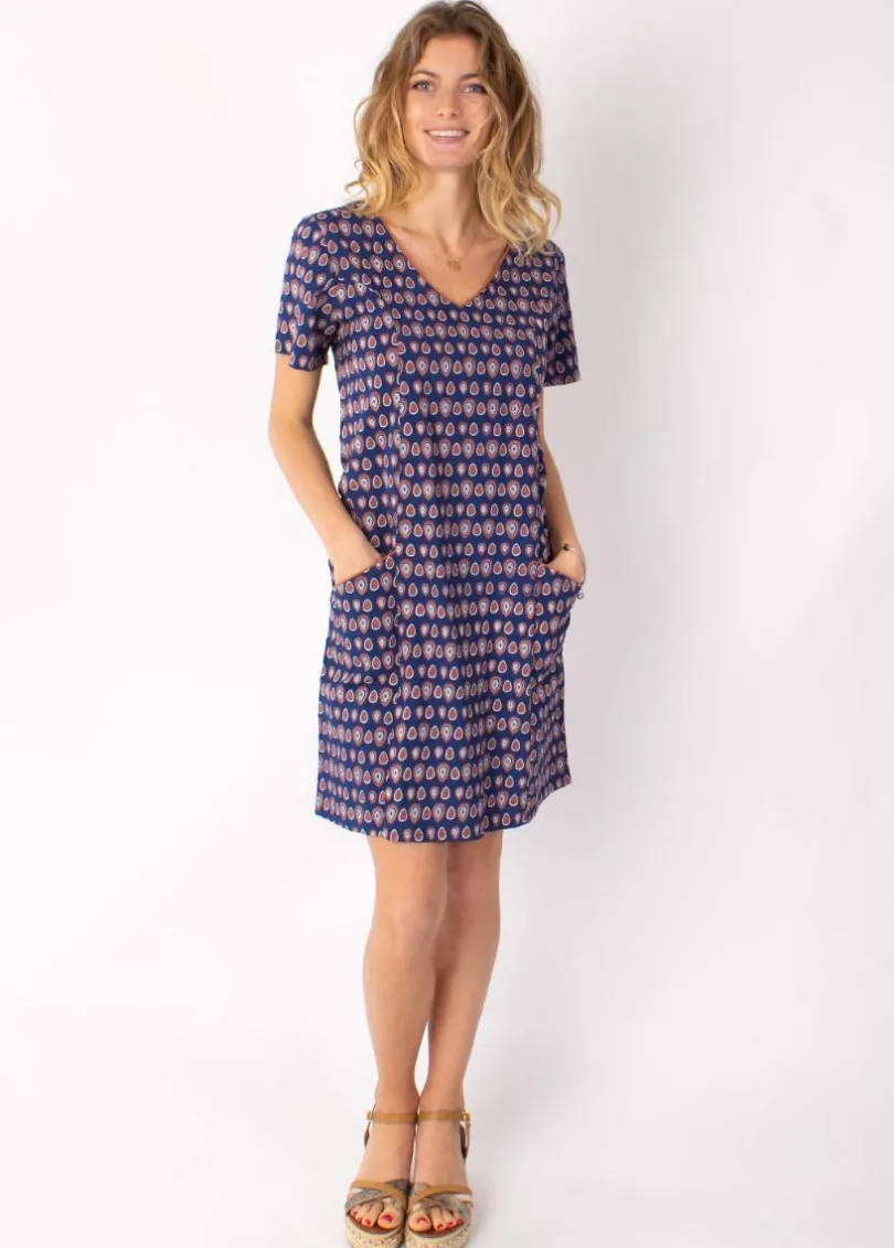Cette robe courte à la coupe droite ample convient à beaucoup de morphologie. On aime ses manches courtes, l’encolure en V devant et dos ainsi que les grandes poches placées sur le devant de la robe.