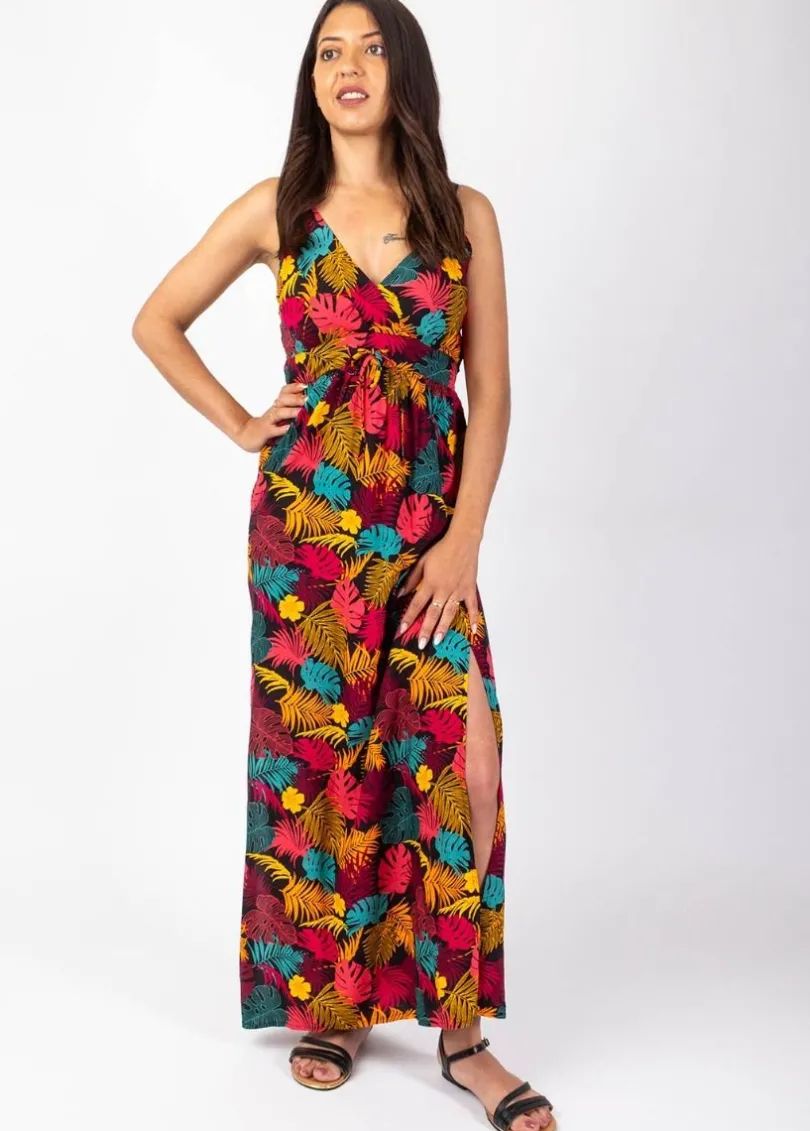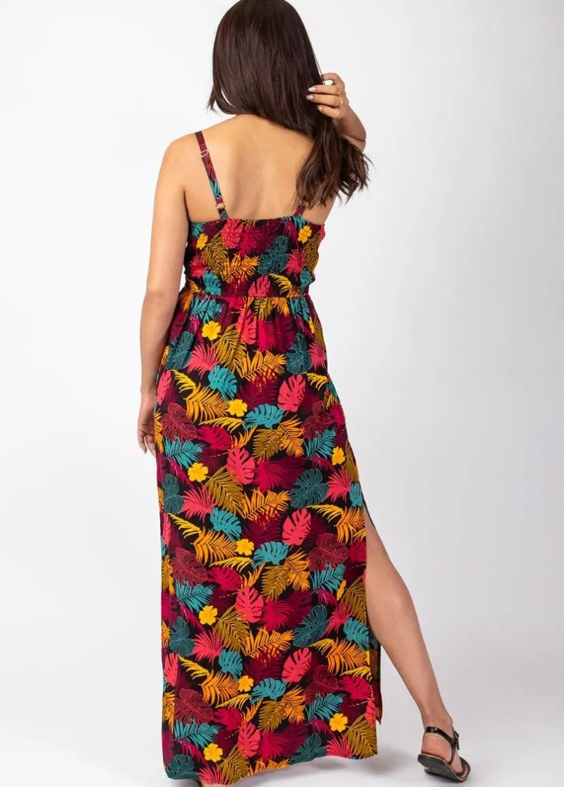 Outlet Coton Du Monde Robe longue fluide GLORIA fines bretelles imprimé tropical Palme Orange