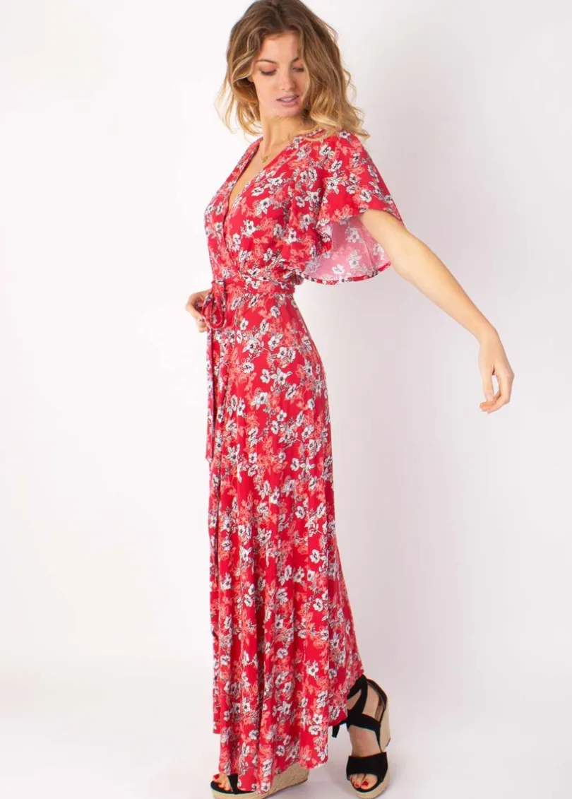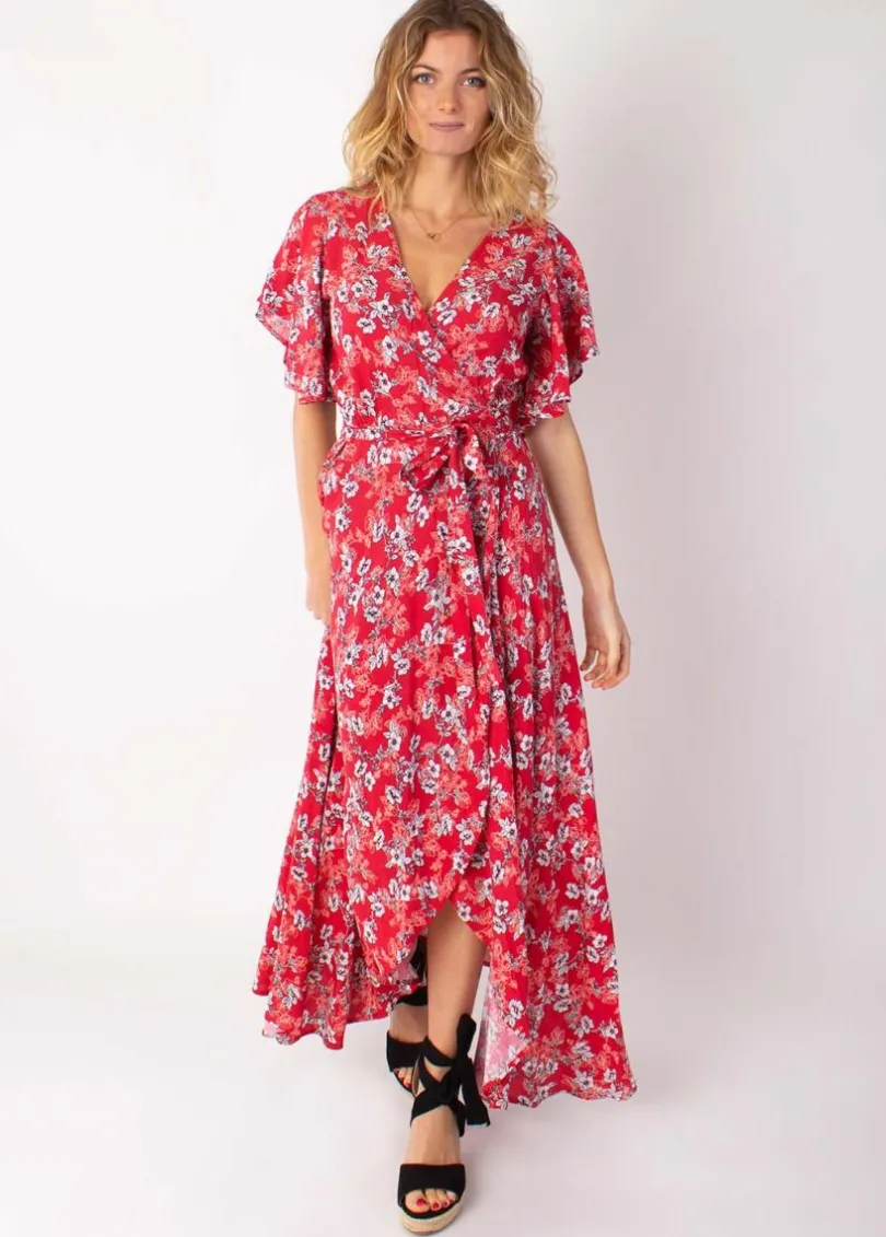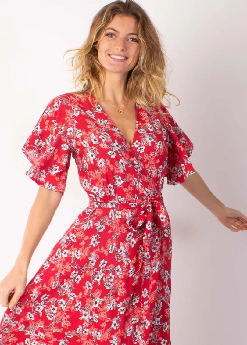 Un vent de fraicheur souffle sur cette robe longue à l’imprimé floral coloré sur fond uni rouge. Découpe cache-coeur…