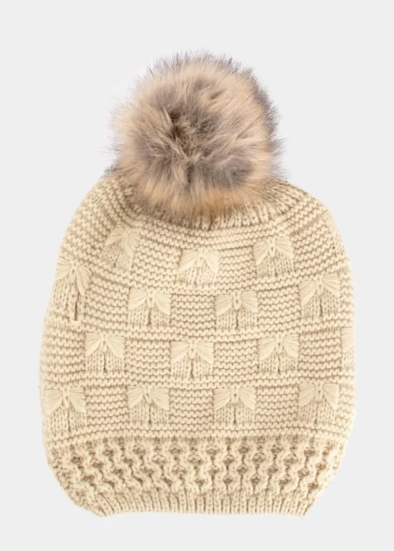 Vous aimerez ce très joli bonnet fantaisie avec des petits noeuds dessinés dans la maille et surmonté d’un joli pompo…