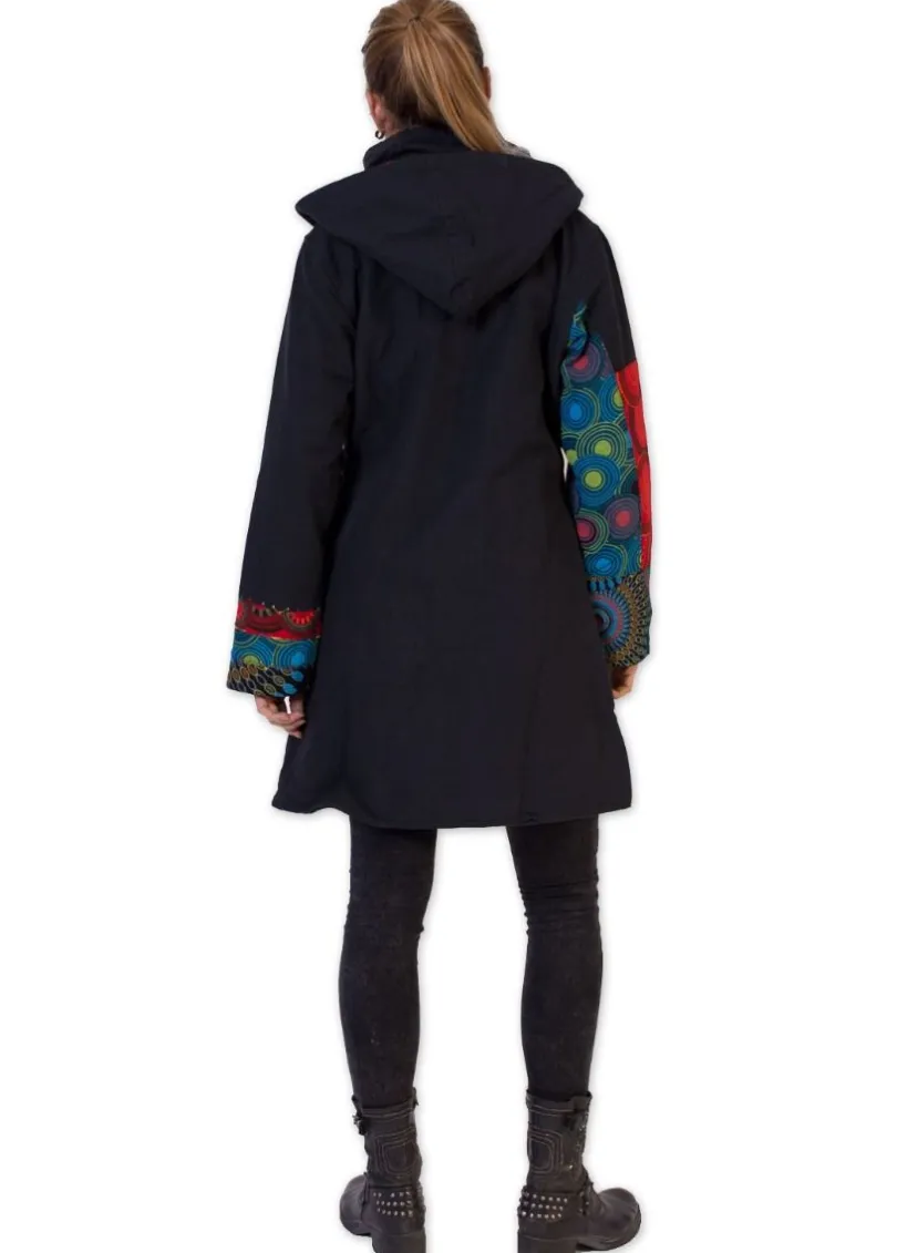 Ce manteau hiver noir en coton et intérieur polaire sera la tendance ethnique pour affronter le froid. Avec sa capuche, ses poches et ses motifs variés graphiques aux couleurs lumineuses, ce manteau en coton chaud vous fera oublier le froid de l’hiver.