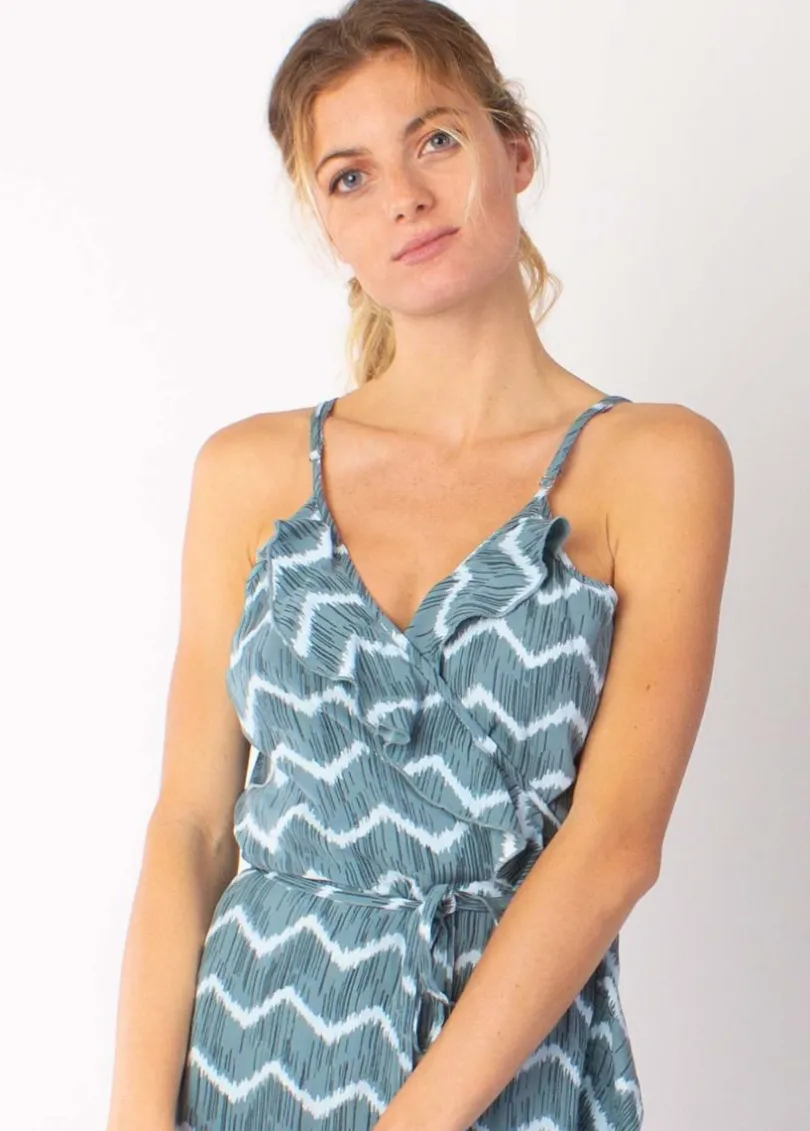 Cette robe longue volantée à fines bretelles sera très appréciée en sortie de plage avec des tongs.