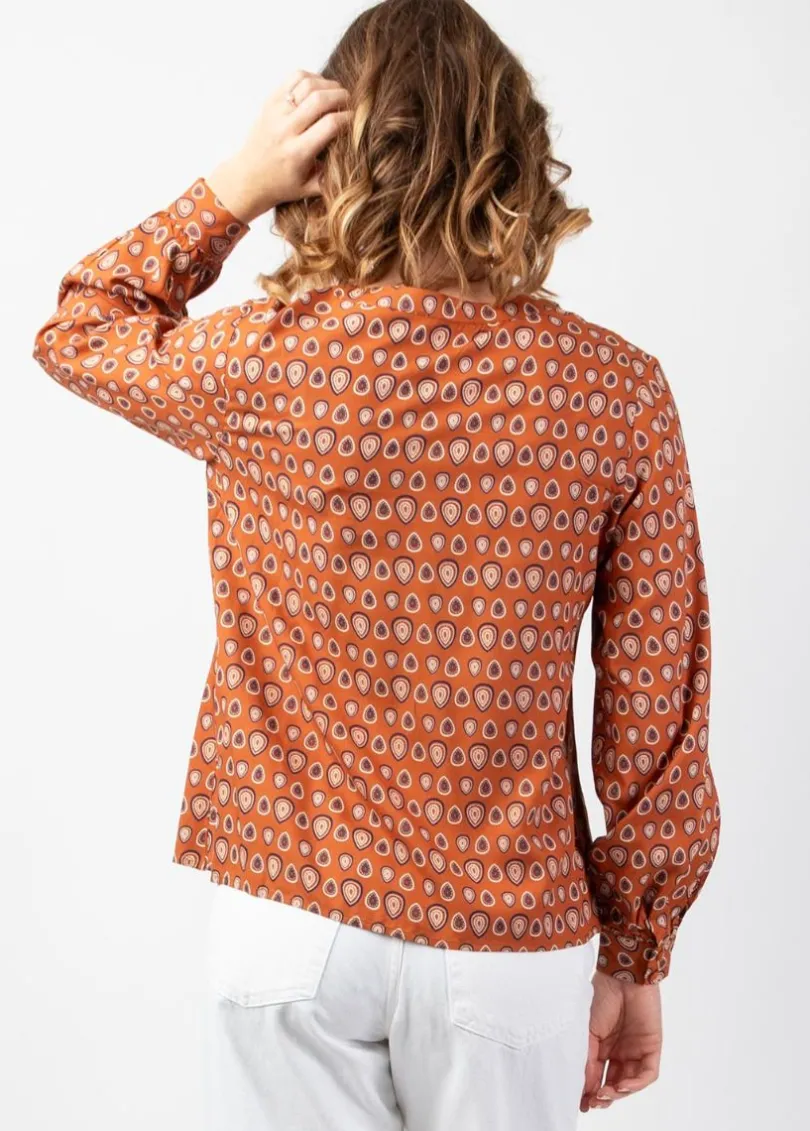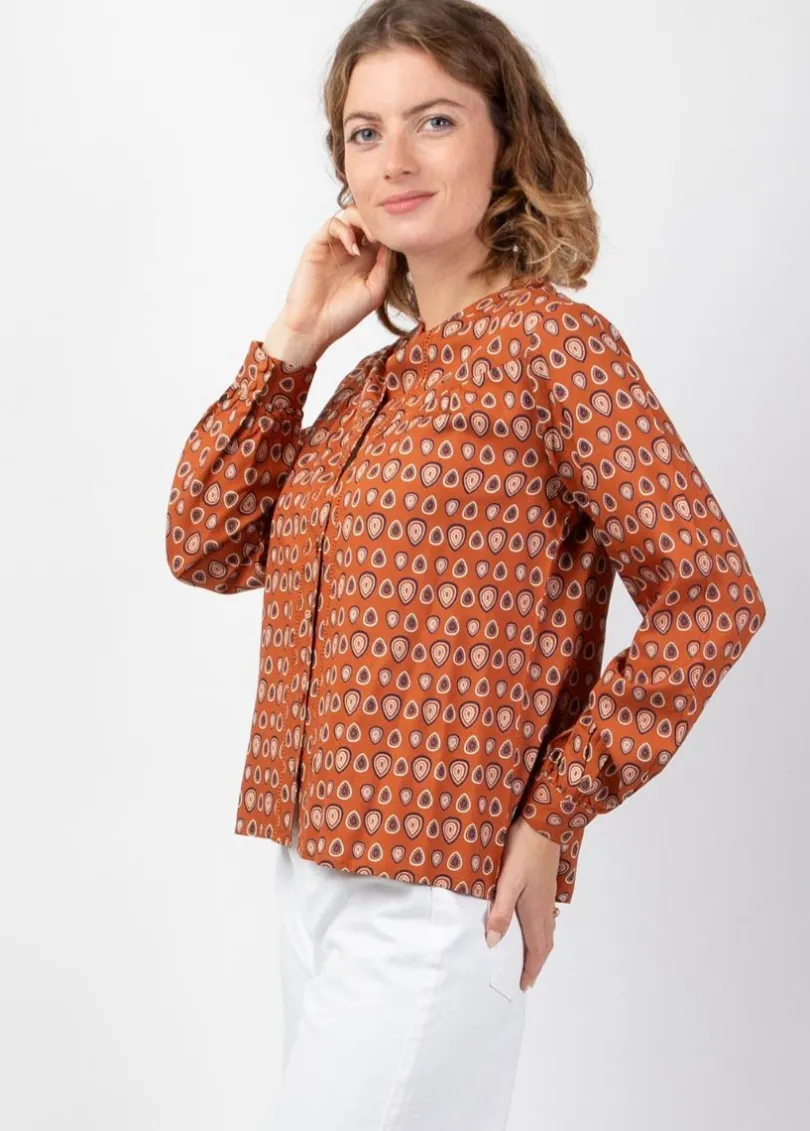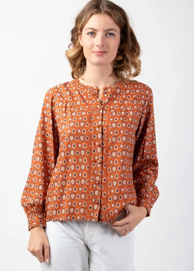 Joli chemisier classique manches longues au motif ethnique camel, très confortable pour commencer la saison automnale. Avec sa coupe droite facile à porter et ses fins liserés ajourés qui structurent avec féminité la patte de boutonnage, le chemisier Joe se portera pour aller au bureau ou pour une soirée festive.