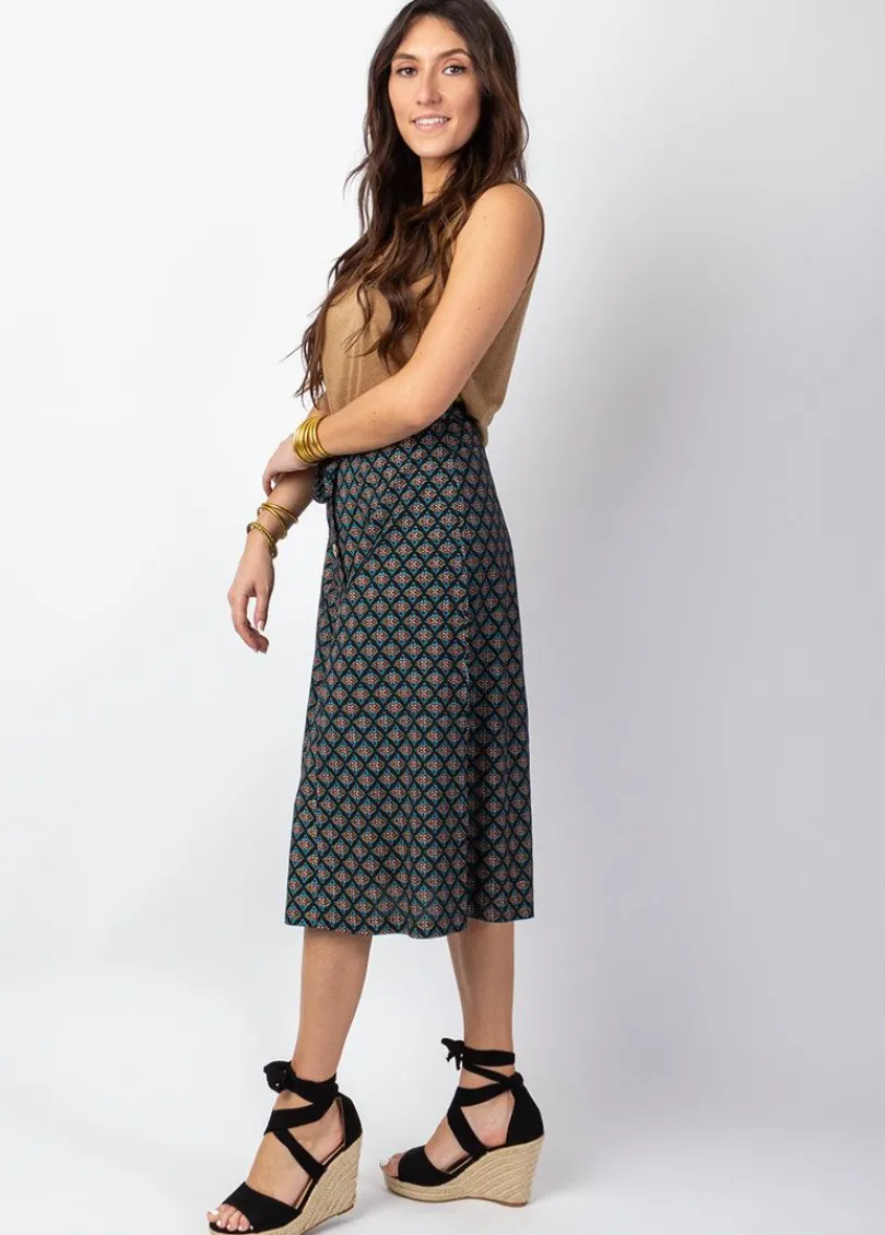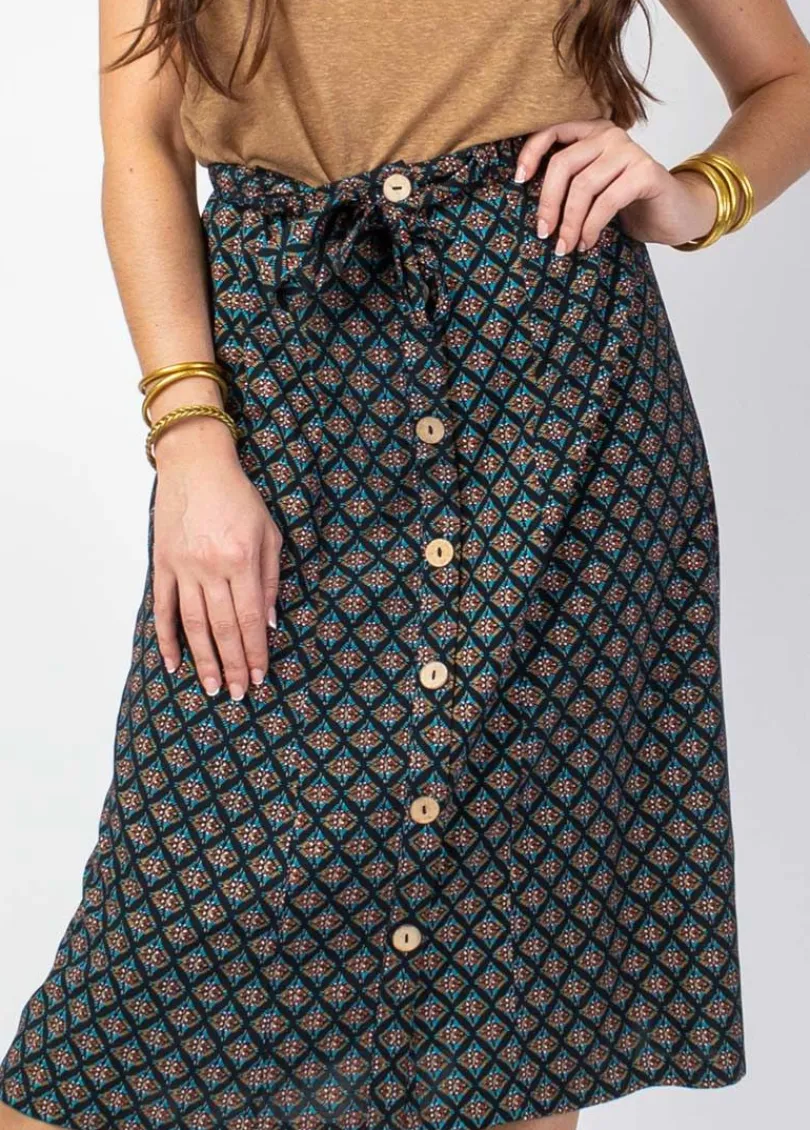 Cette jupe midi à la coupe légèrement évasée est très agréable à porter. Pratique avec sa boutonnière tout le long de la jupe et sa ceinture à nouer, on aime sa matière en coton et son motif ethnique graphique tendance africain.