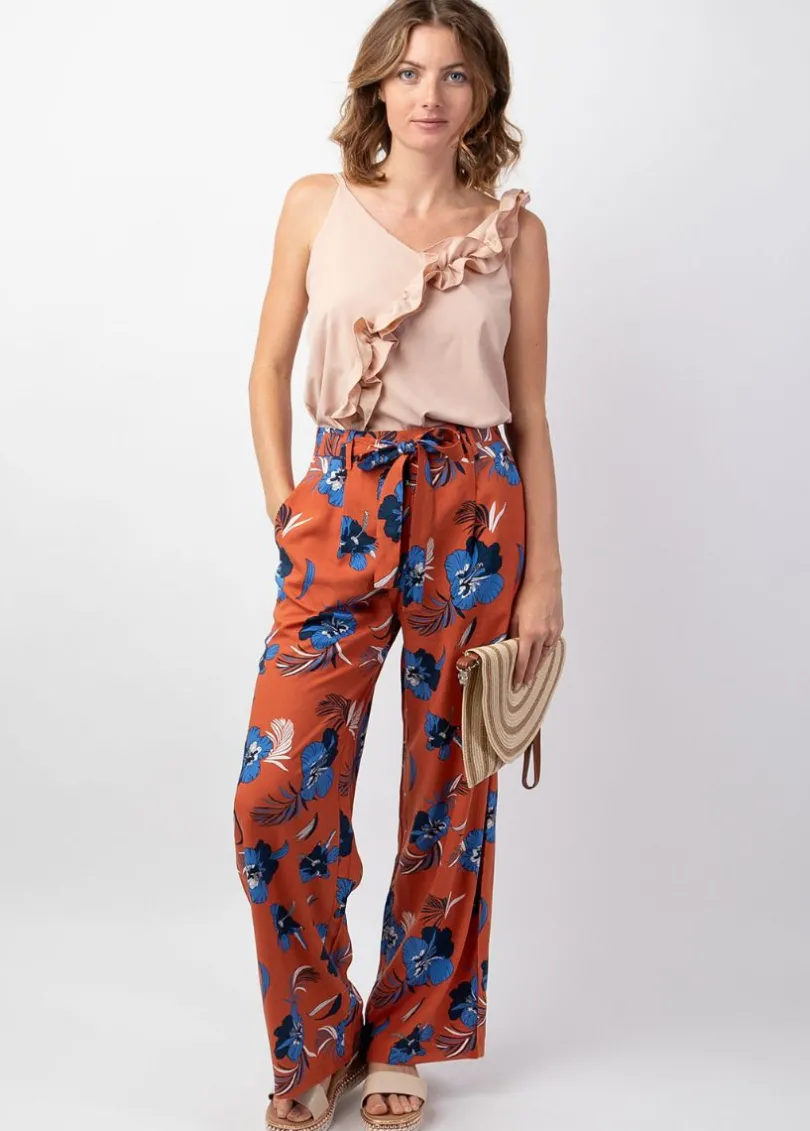 Superbe pantalon aux douces couleurs terra cotta et bleu sera la pièce tendance de votre quotidien.Très confortable avec ses jambes larges, sa coupe droite et sa matière fluide. Ce pantalon magnifique rehaussera toute tenue et mettra en valeur la silhouette.