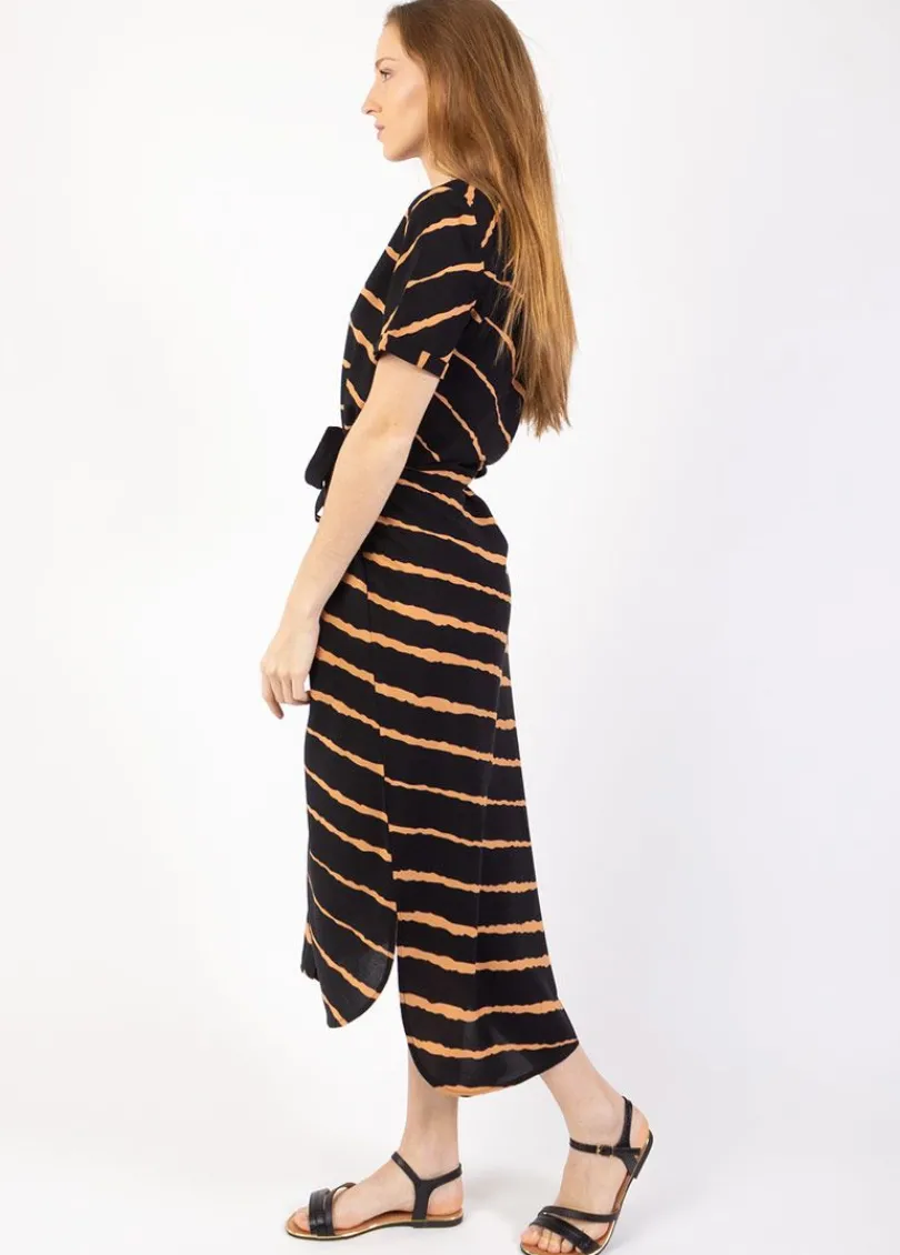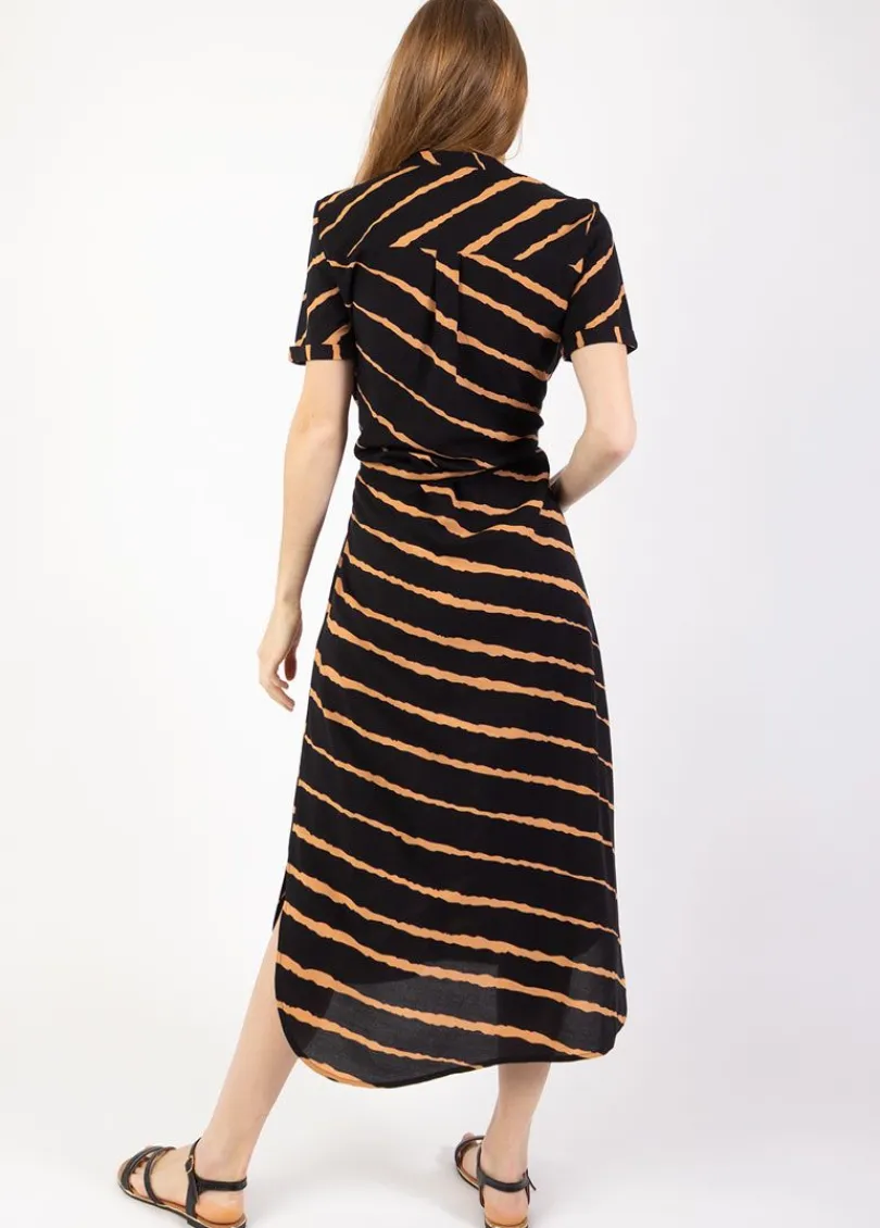 La robe longue Sheila à la coupe droite et au bas légèrement arrondi adoucit l’ensemble. Petit col tunisien, manches courtes, cette robe chemise tie&dye noire aura tout pour vous séduire.