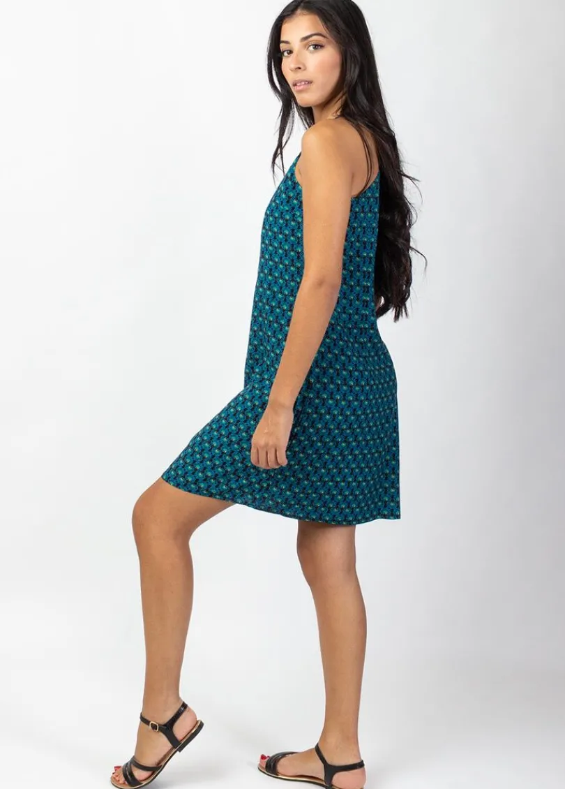 Légère robe courte de plage facile à porter pendant les journées chaudes d’été. Sa matière en viscose fluide, la coupe droite et le joli dos nageur maintenu par trois liens finition bretelles froncées sur les épaules, donnent une belle allure à la silhouette. L’imprimé ethnique bleu finit de nous charmer.