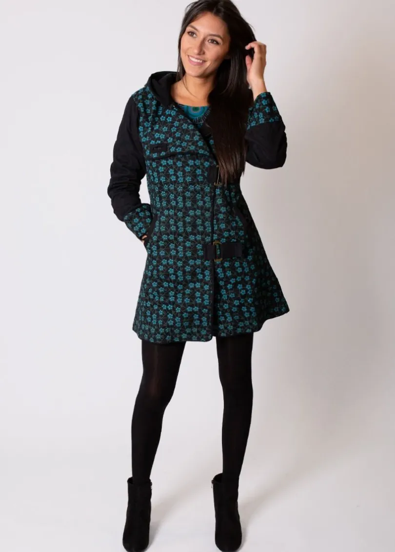 Le manteau hiver aux imprimés fleuris bleutés s’associera avec vos robes et vos jeans sans problème. Très confortable, ce manteau sera facile à porter pour un look casual cet hiver.