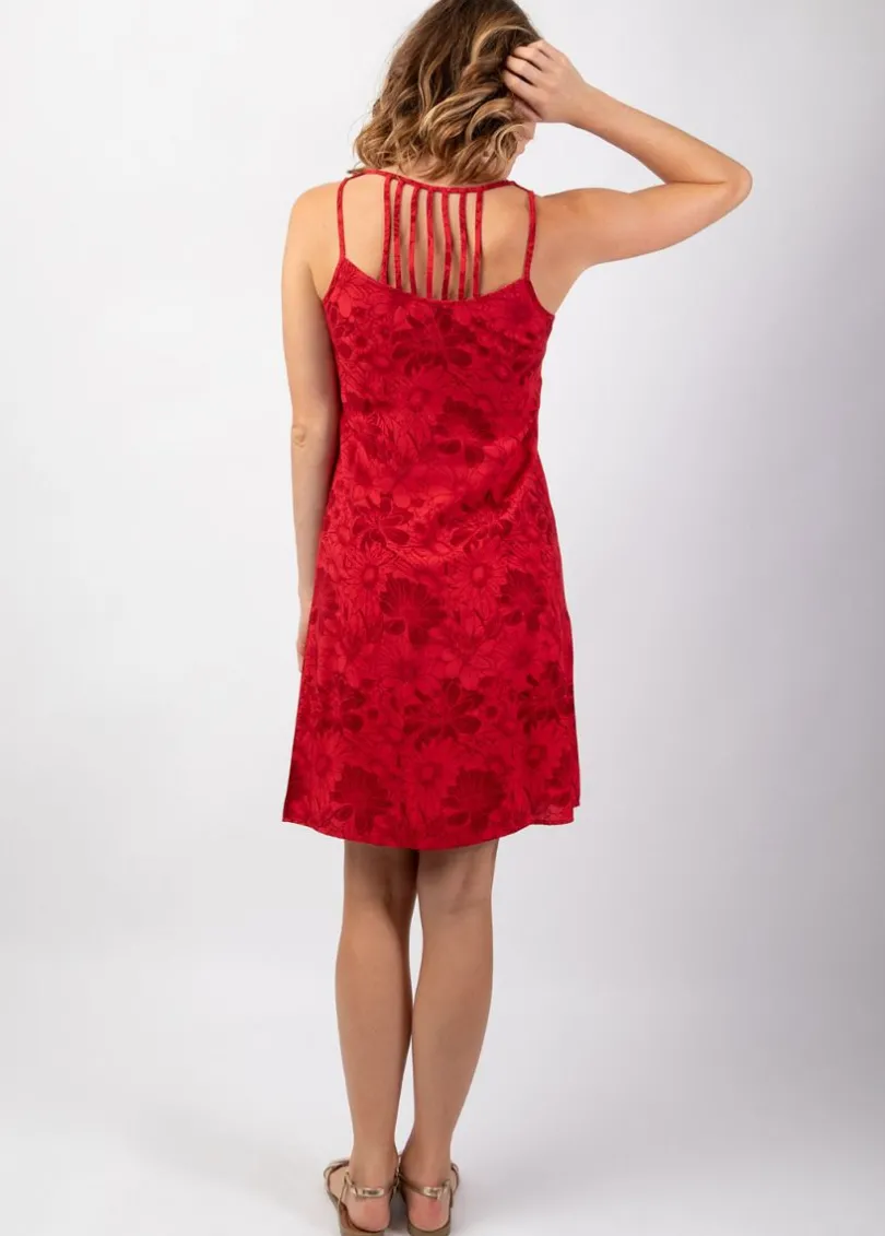 Robe courte en viscose à fines bretelles ajourées sur l’épaule et dans le dos. On aime cette robe ethnique à l’imprimé floral rouge chic, très élégante à porter lors d’une soirée habillée. La ligne fluide et les bandes de tissu en haut du dos donnent une allure ultra-féminine à la robe.