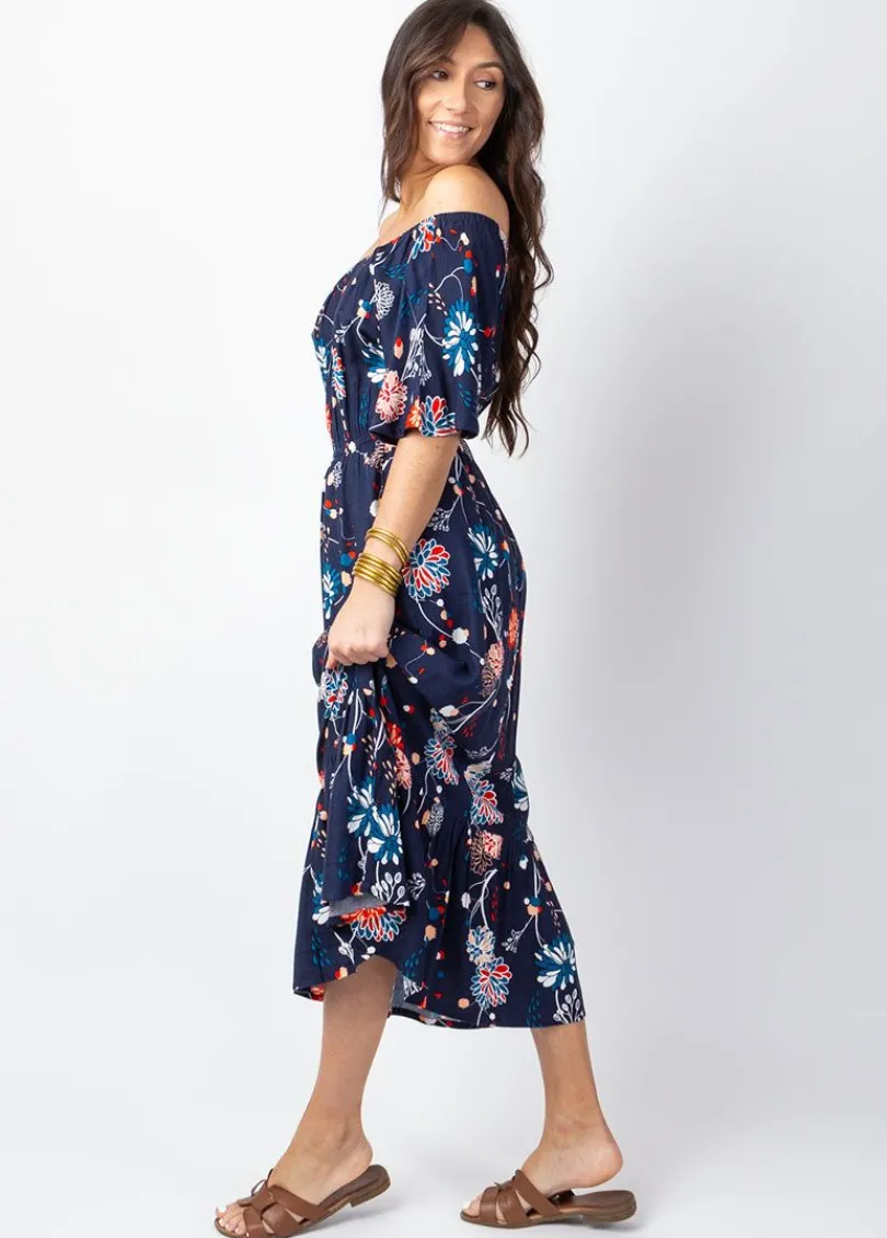 Store Coton Du Monde Robe longue chic DALIA col bardot imprimé fleuri bleu Pollen