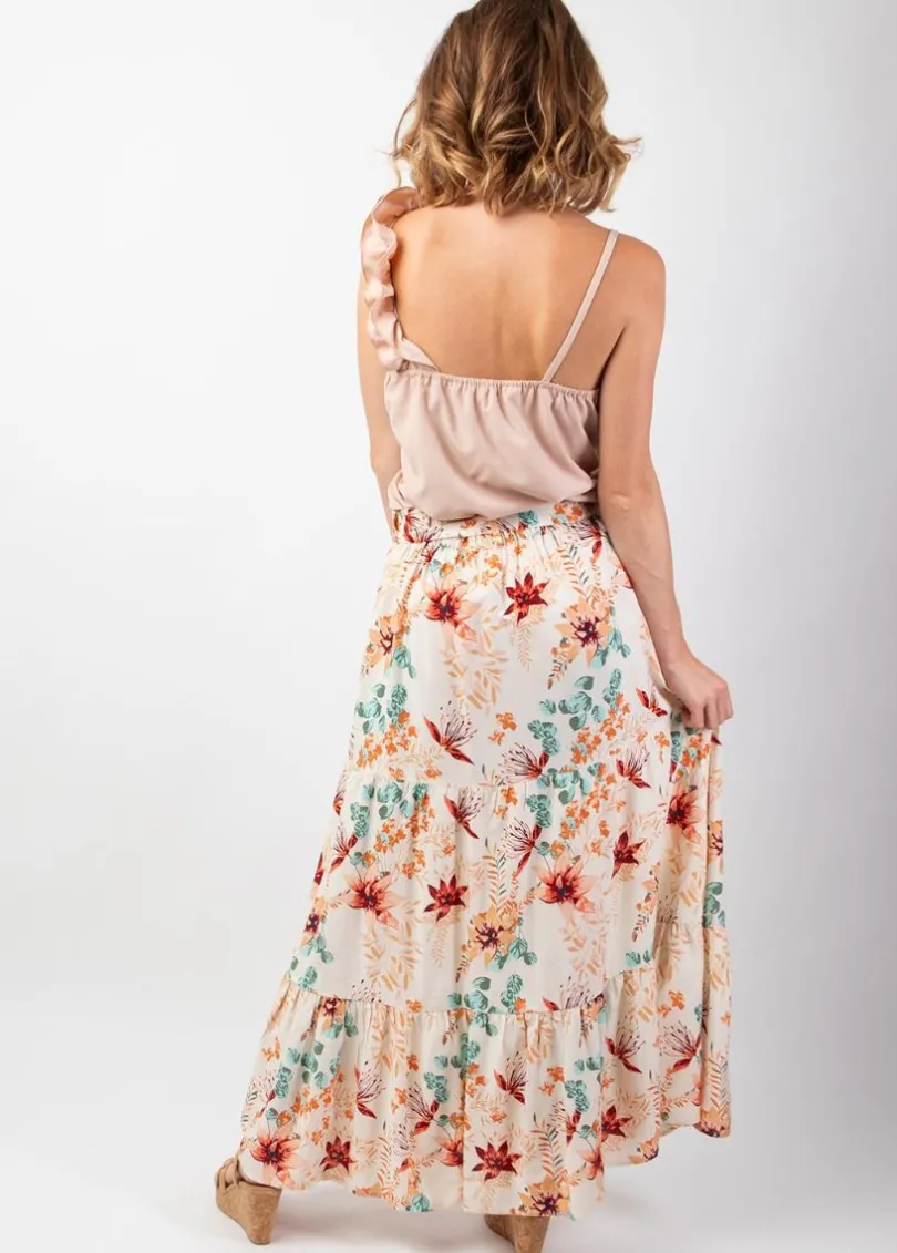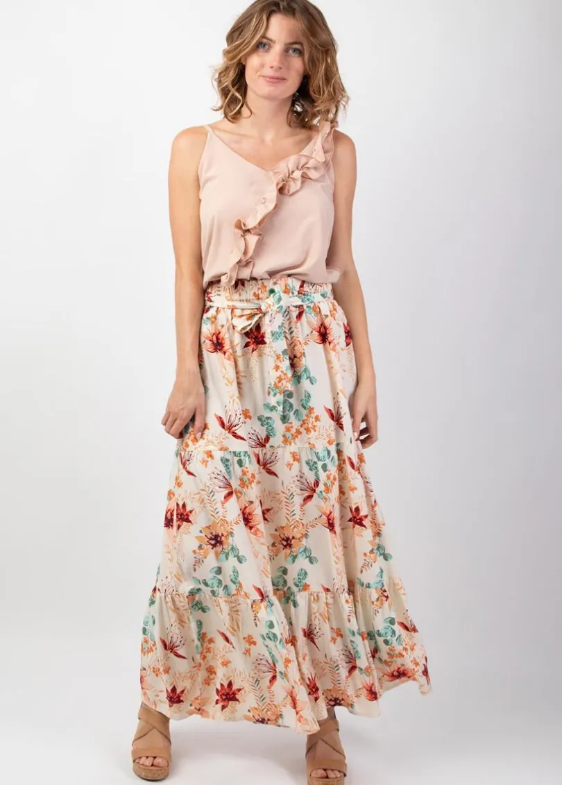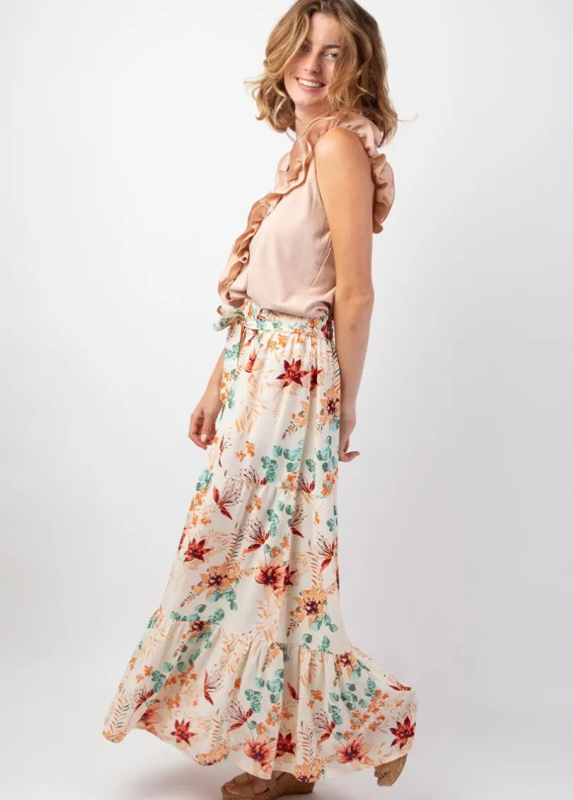 Jupe longue bohème chic à l’imprimé fleuri et à la coupe fluide évasée. La taille haute élastiquée convient à toutes les silhouettes et peut se cintrer avec la ceinture amovible du même tissu. Cette jupe chic et tendance sera parfaite en saison estivale et se décline en plusieurs motifs et coloris.