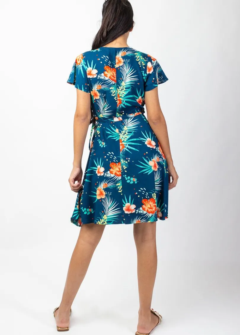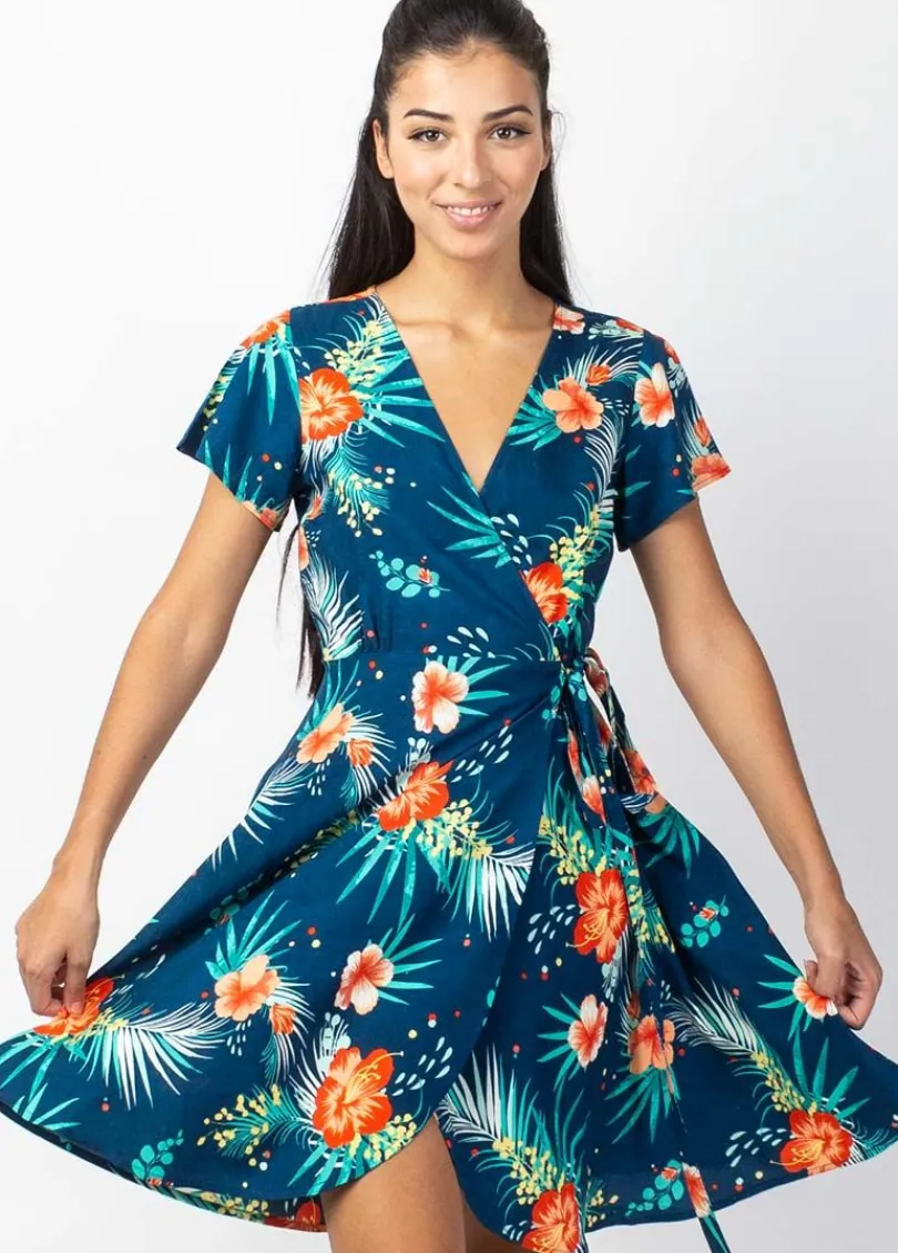 Best Coton Du Monde Robe courte MARIKA fluide cache-cœur imprimé fleurs tropicales Maui