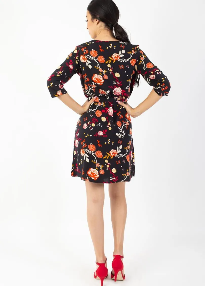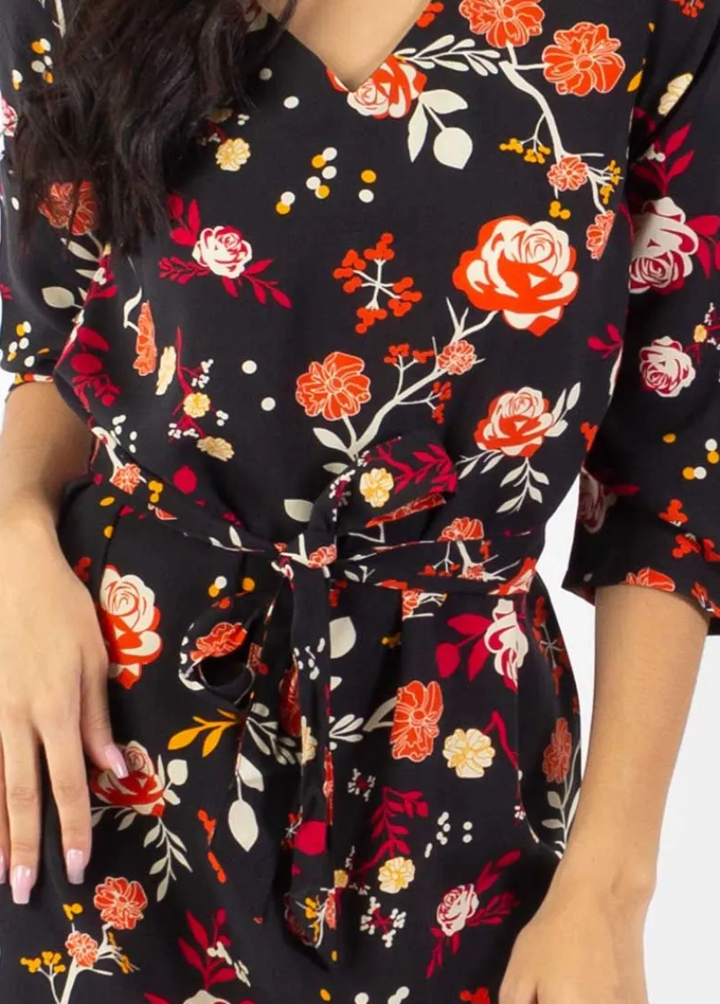 Best Sale Coton Du Monde Robe courte manches 3/4 fluide LEYLA imprimé fleuri noir 28 Noir