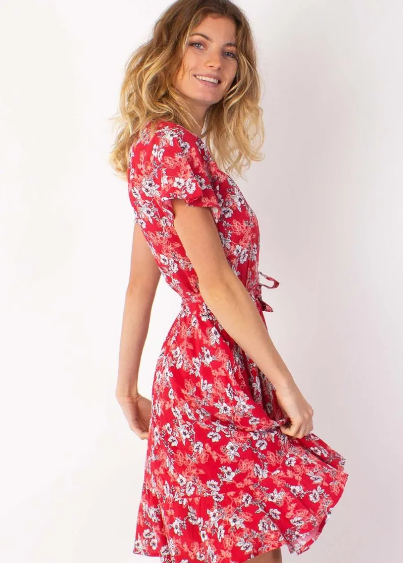 Best Sale Coton Du Monde Robe courte MARIKA fluide cache-cœur fleurie rouge 8 Rouge