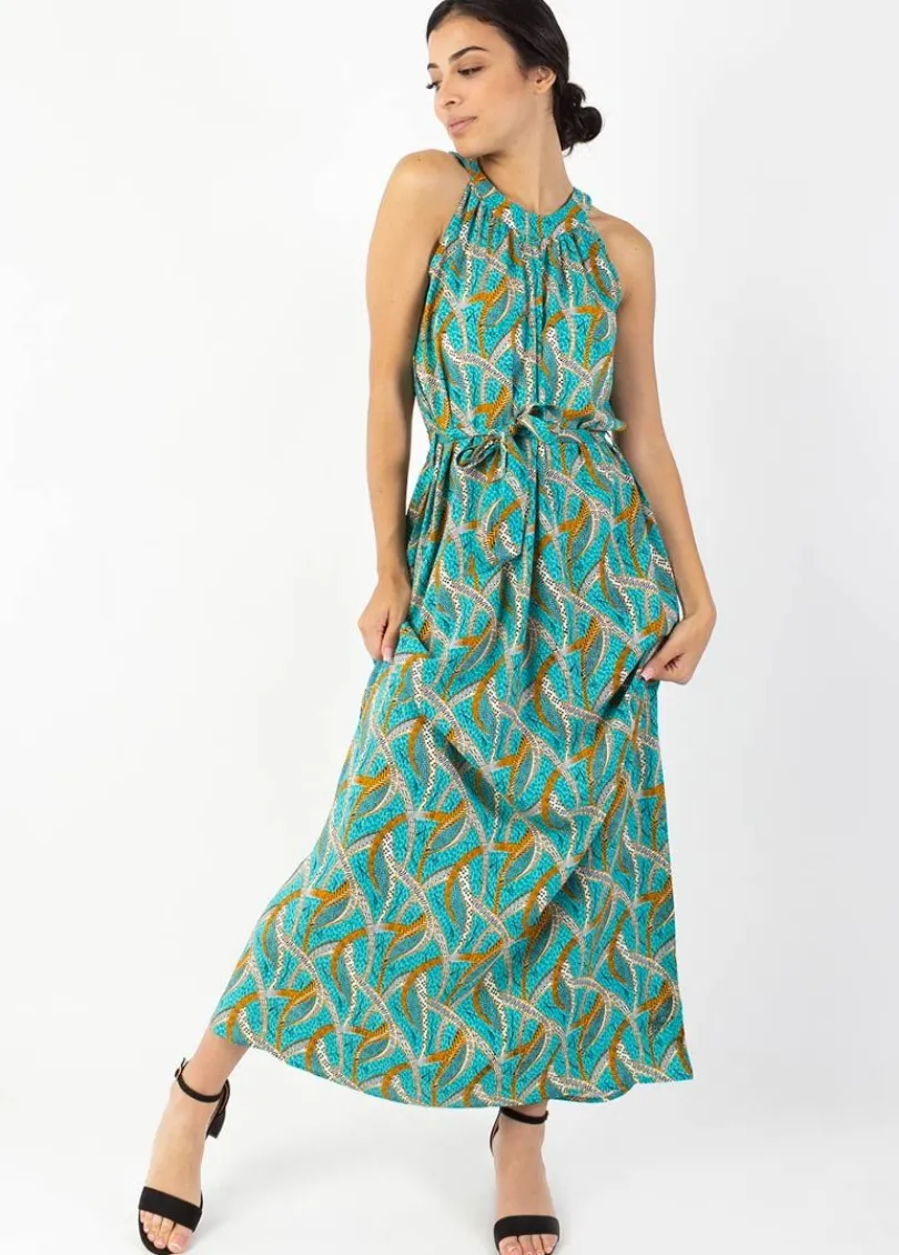 Best Sale Coton Du Monde Robe longue col licou FRIDA imprimé ethnique bleu Savane Bleu
