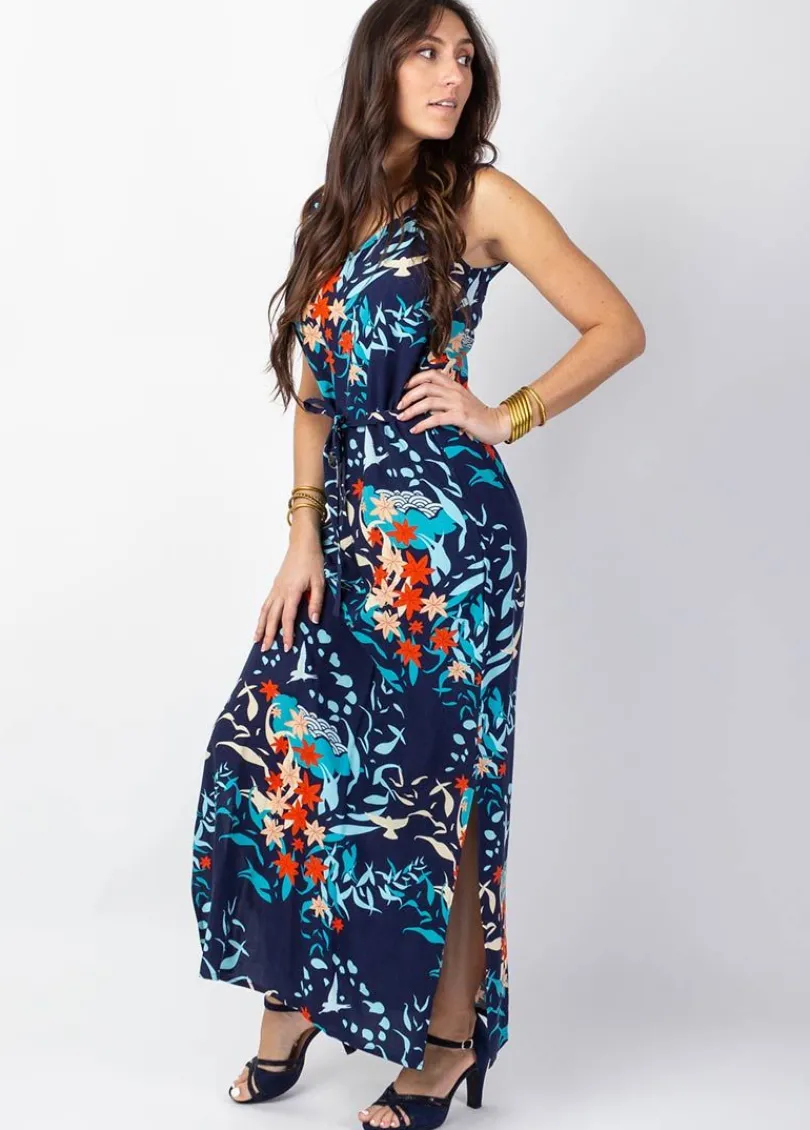 Voyagez avec cette jolie robe longue aux motifs ethniques. Coupe longue droite fendue, ceinture amovible du même tissu que la robe, larges bretelles se terminant par une encolure en V.