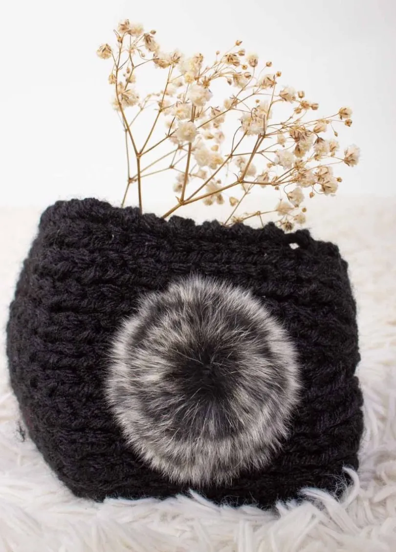 Très joli bandeau noir imitation laine. Ajustable grâce aux deux boutons de réglage à l’arrière.On aime la finition de ce bandeau avec un pompon fantaisie sur le dessus. Optez pour un look ethnique chic tout en restant bien au chaud.