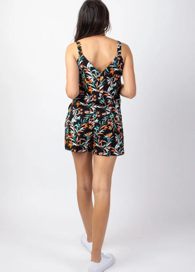 Facile à porter, ce combi-short fluide et léger en viscose vous accompagnera tout le long de l’été. On aime sa coupe simple et agréable ainsi que son motif tropical coloré sur fond noir. Agrémentez ce combi-short de basket pour un look totalement casual.