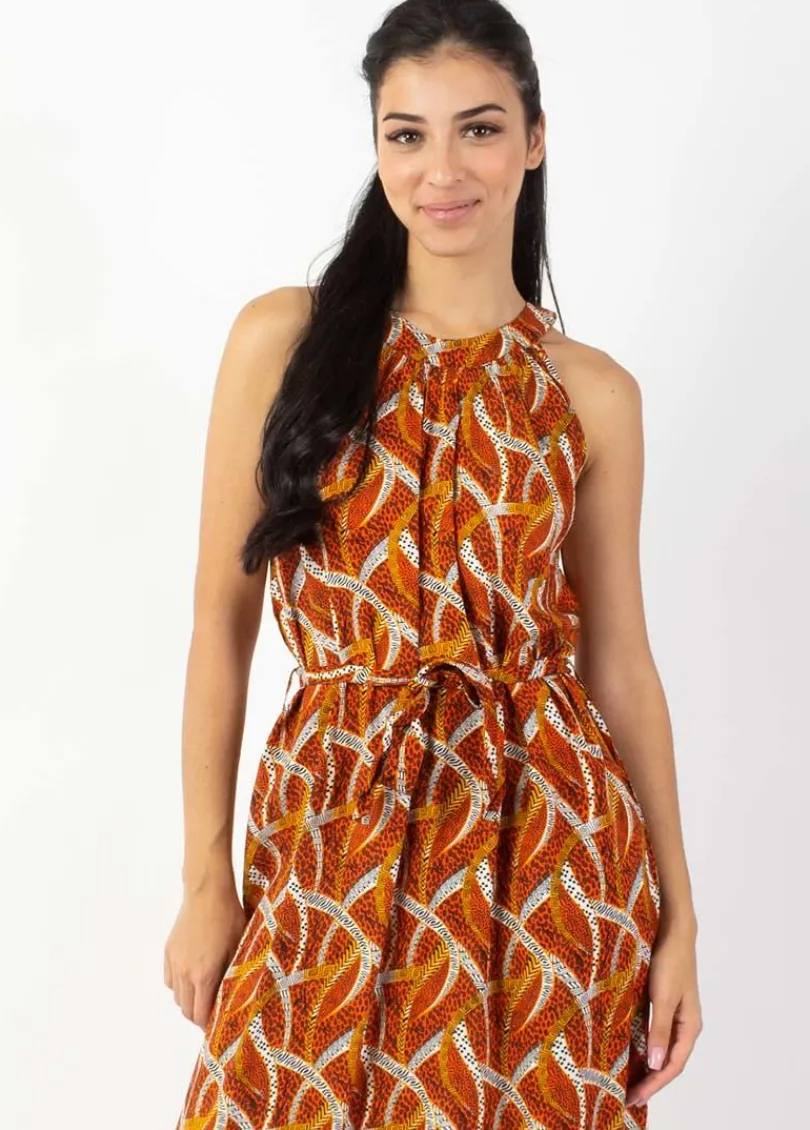 Cheap Coton Du Monde Robe longue col licou FRIDA imprimé ethnique orange Savane Orange