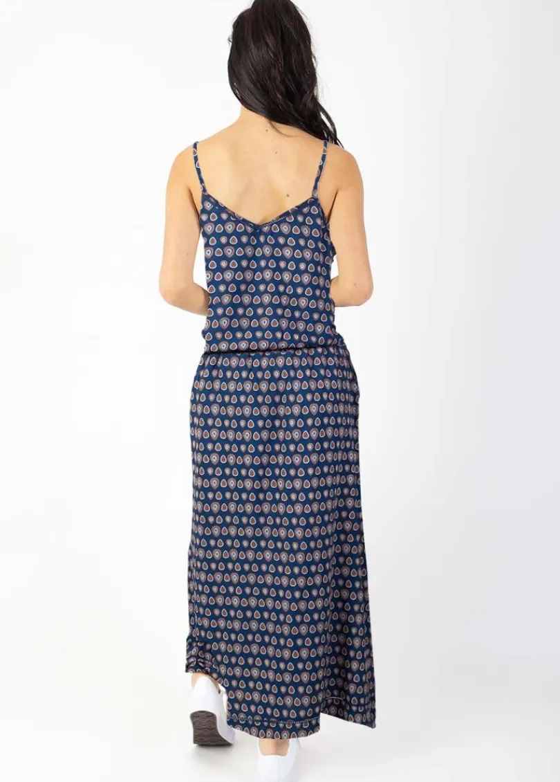Cette robe longue à fines bretelles et aux motifs bohoo ethnique marine sera une pièce tendance de votre dressing. A porter en robe de plage ou avec une paire de baskets, n’hésitez plus cette robe longue fluide et légère est faite pour vous!