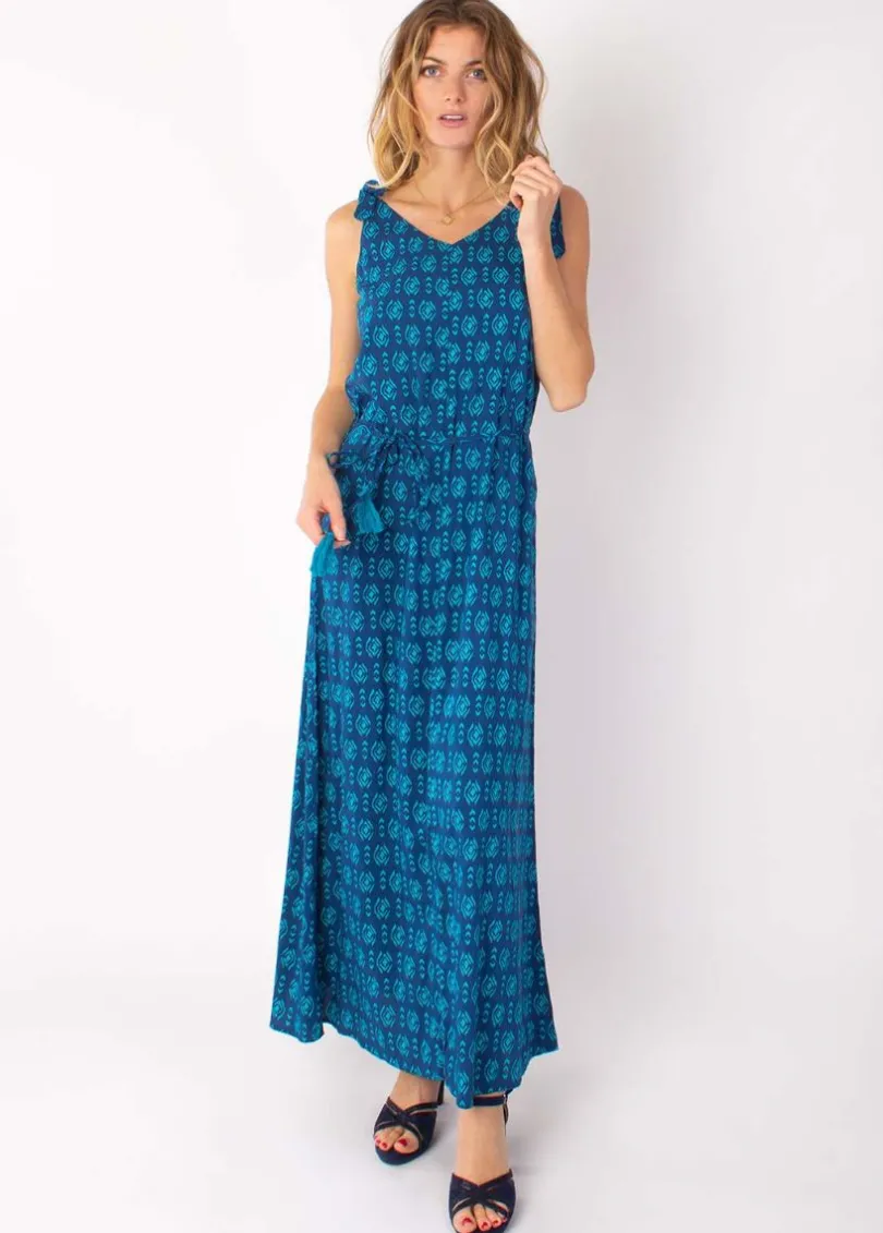 Cheap Coton Du Monde Robe longue fluide LUDMILLA imprimé ethnique marine 12 Bleu