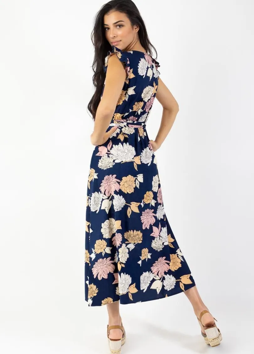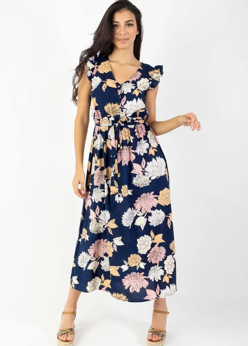 Son imprimé floral marine aux pivoines dessinées assure une allure féminine et casual à cette robe légère et fluide.