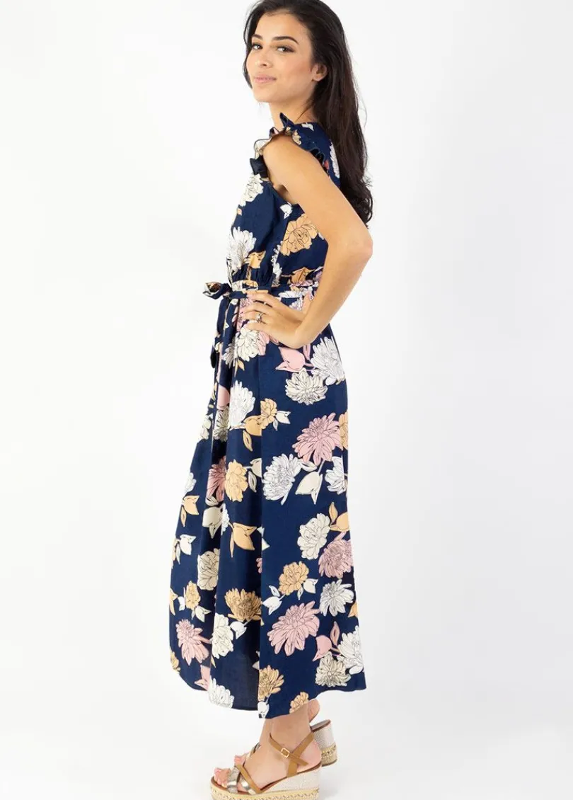 On aime cette robe longue au style bohème chic.Son imprimé floral marine aux pivoines dessinées assure une allure fé…