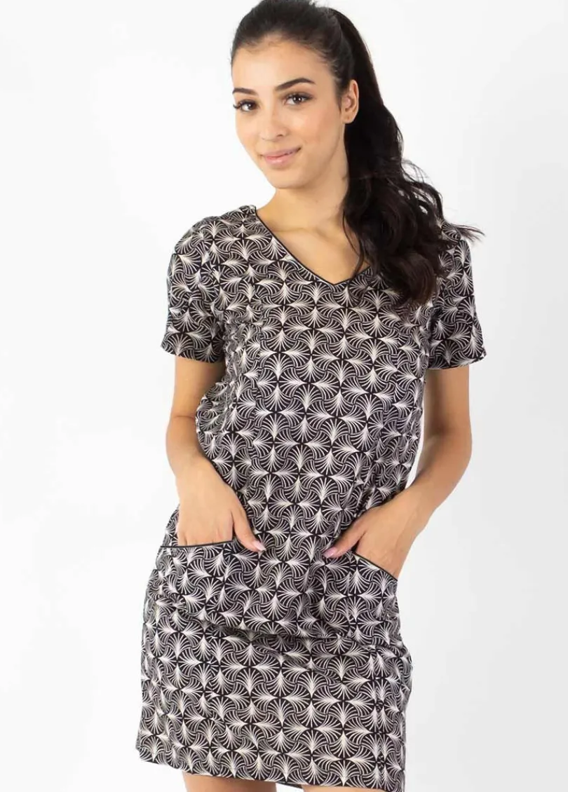 Idéale pour toutes les morphologies, cette robe courte en coton et aux motifs noir et beige qui rappellent les feuilles de papyrus très tendance soulignera avec simplicité votre silhouette. On aime sa coupe droite, ses manches courtes, ses poches profondes sur le devant de la robe ainsi que la légère ouverture fantaisie en haut du dos. Une pièce féminine très facile à porter.