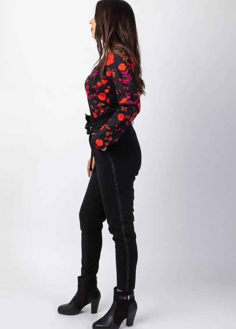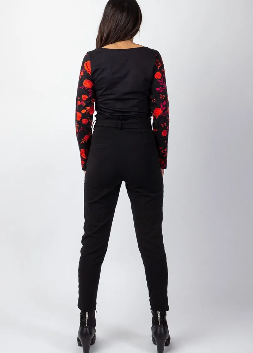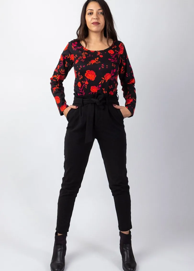 On aime le motif fleuri composé de superbes roses rouges qui illuminent ce top noir.